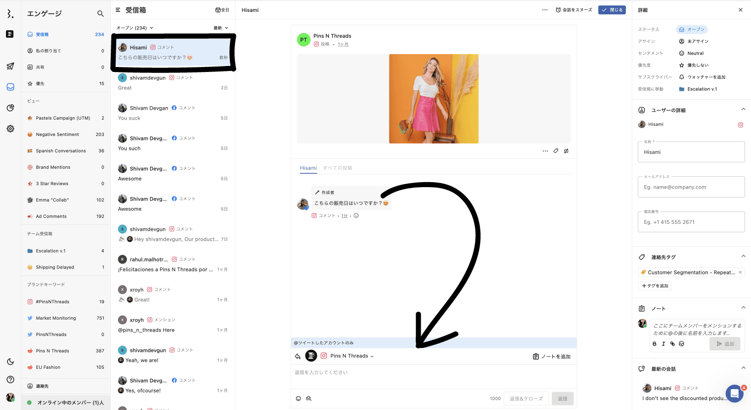 このような受信トレイは通常、チケット管理ツールと呼ばれ、1つのコメントやDMを「チケット」化することで、整理と優先順位付けを伴いながらチーム全体でのアクティブサポートを有効にするものです。