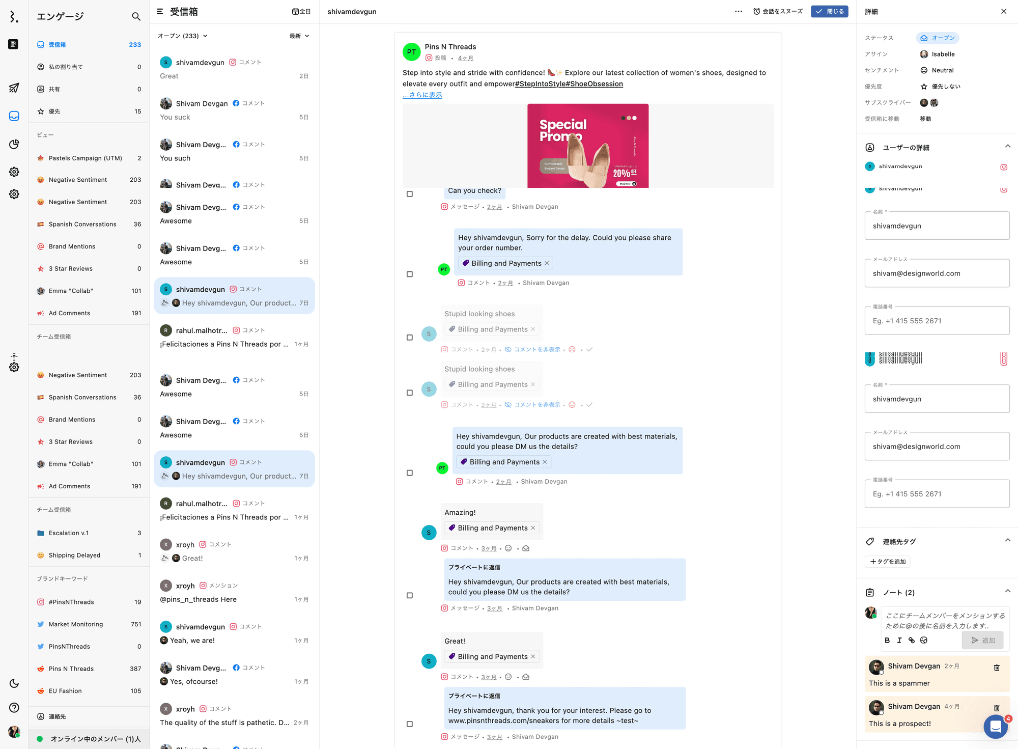 同期されたコメントなどはダッシュボードの左手にチケットして表示され、開くとユーザー情報からセンチメントまで全て自動で判別されます。