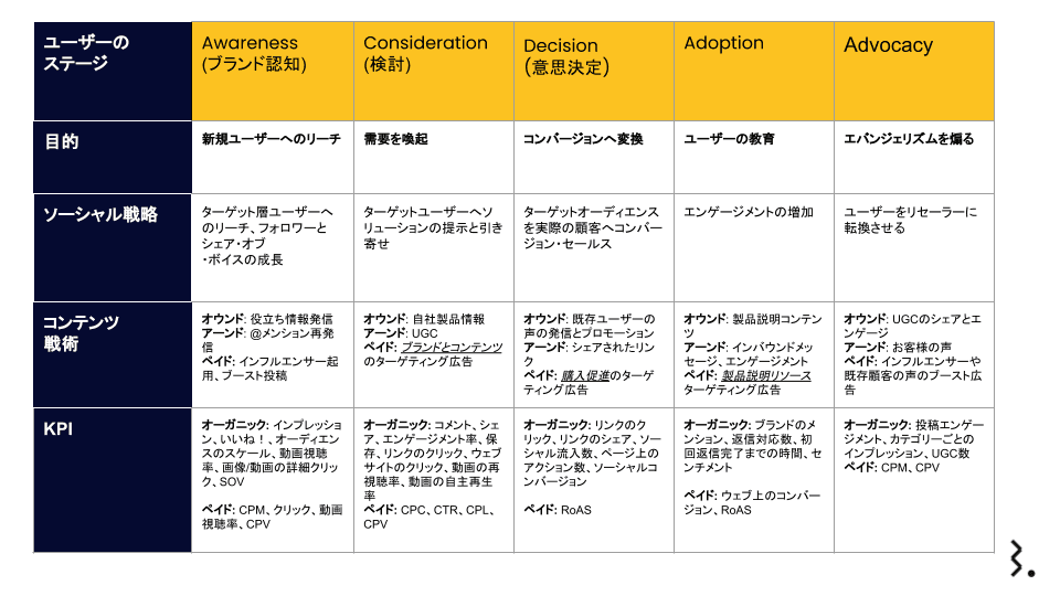 ソーシャルメディアのこのファネルに基づいて、何が推奨されるべきで、どんなことに着眼すべきかを表にまとめました。
