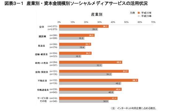 総務省が平成30年に発表した産業別のソーシャルメディア運用状況です。