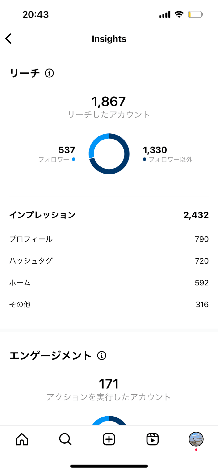 以下は私のInstagramのアカウントインサイトですが、リール投稿では、98%フォロワー以外の方にリーチしたことがわかります。