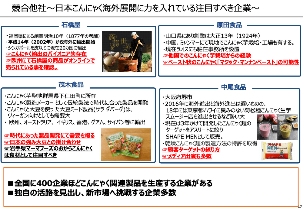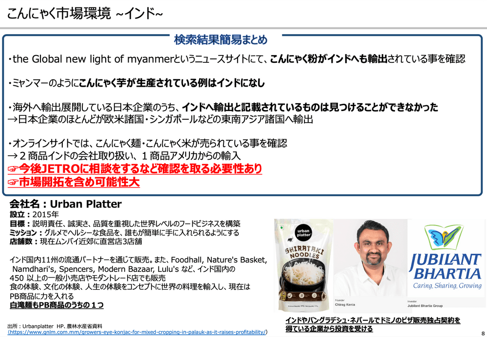 競合他社となりうる企業:こんにゃくゼリーの競合他社となりうる企業を確かめた結果、アジア輸入店を営んでおり、こんにゃく麺の輸入を開始しているムンバイにあるUrban Platterをはじめ、日本、その他の国でこんにゃく生産を行なっており海外輸出に力を入れ始めている企業群が挙げられます。