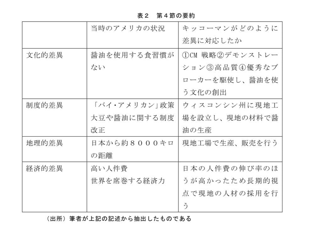 商品に関しても、かつてキッコーマンがアメリカで醤油を売る際、アメリカの国民フードであるBBQの肉のソースとして売り込みを進めたよう絞る必要があります。上記の文化的差異以外にも、制度的、地理的、経済的差異に関しても着目する必要があり、その上で商品を決める必要があります。以下は、キッコーマン醤油がアメリカ進出した際に考えられるCAGEフレームワークです。