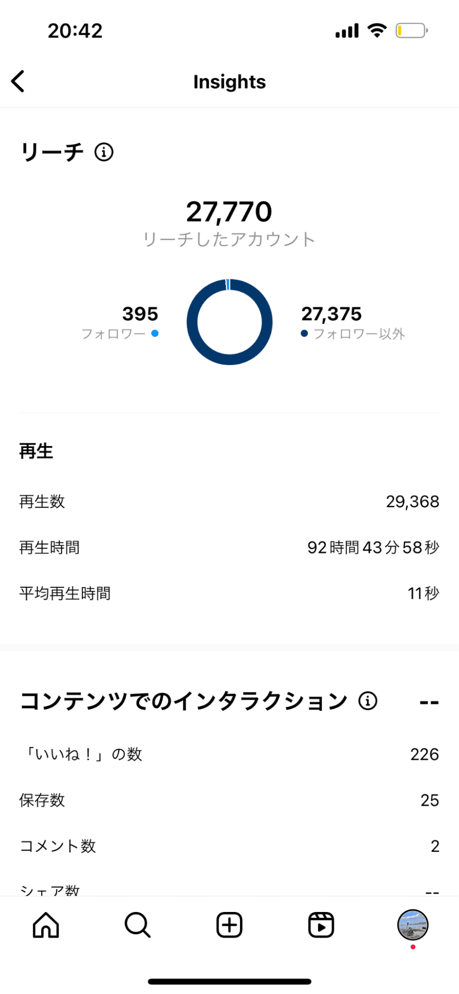 リール投稿で、気をつけるべきポイントは、平均再生時間及び再生数です。こちらのリールでは、全体で27秒のリールに対し平均再生時間は11秒、4割の時点だということがわかります。