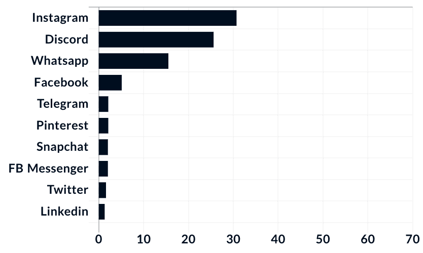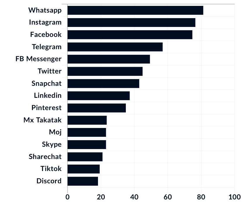2022年のデータによると、インドではWhatsAppが最もユーザー数の多いソーシャルメディアプラットフォームの座を占めており、InstagramやFacebookといった他のメタ傘下のプラットフォームが僅差で続いていることがわかります。しかし、ユーザー数の多さと利用率は必ずしも一致せず、AXIS My Indiaが2023年1月に実施した最近の消費者意識調査では、35%のユーザーがFacebookを最も頻繁に利用するソーシャルメディア・プラットフォームと考えており、これは同国で最も高いことが明らかになりました。一方、最も好んで使用するソーシャルメディアでは、Instagramが30%を超えました。Facebookより3倍もの割合で最も好んで使用すると回答されました。