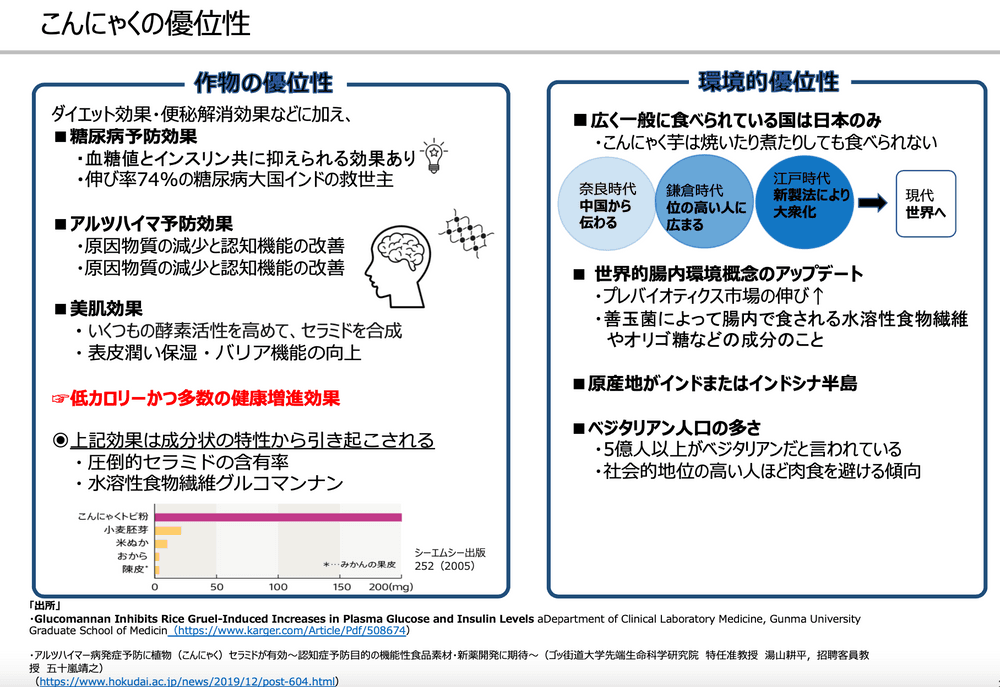 こんにゃくは日本の伝統健康食材であり、ヴィーガン食材でもあります。糖尿病・アルツハイマー・肥満予防に効果があり、代替肉の素材としても注目・インドが原産地というように健康面・環境面双方の面から可能性に溢れています。