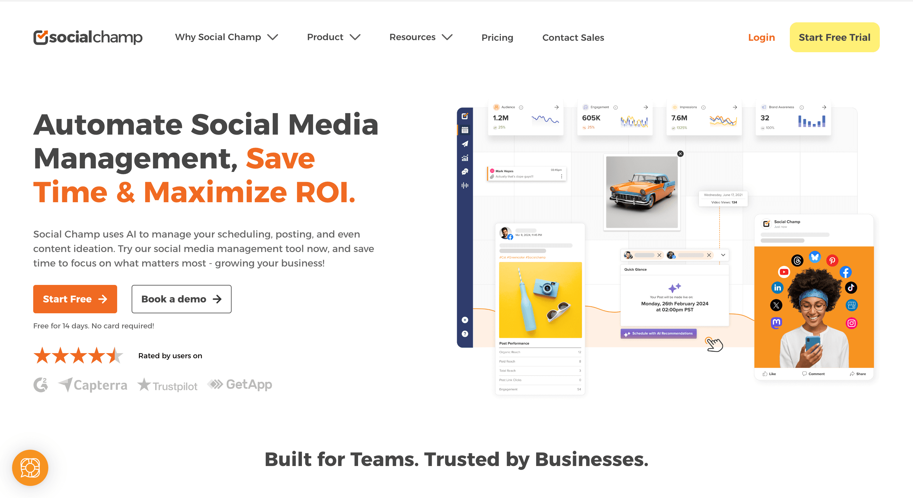 Social Champは日本では知られていませんが、こちらも長くから業界のリーダーの一つです。スモールビジネスにとって特に手が出しやすく、「チームメンバーへのアクセス権限設定」がわかりやすくコラボレーションを求めるようであれば便利です。