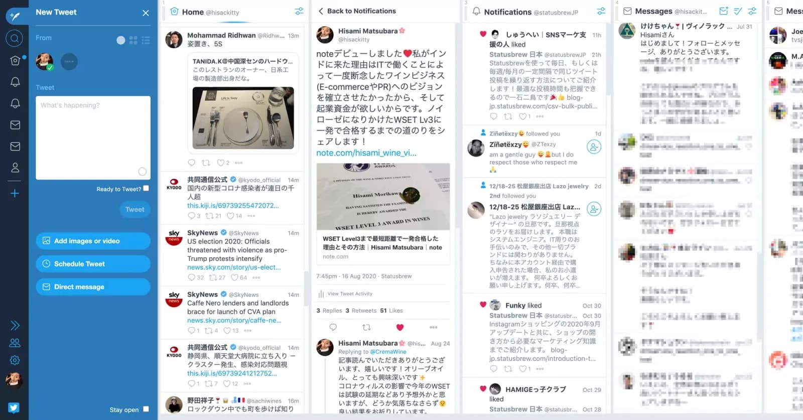 Tweetdeckはその名の通りTwitterの運用に対して無料で整理したり、投稿をスケジュールしたりするのに便利なツールです。フォローしているハッシュタグから、キーワードやメッセージまで、Twitterのあらゆる投稿を俯瞰的に確認できるツールです。
