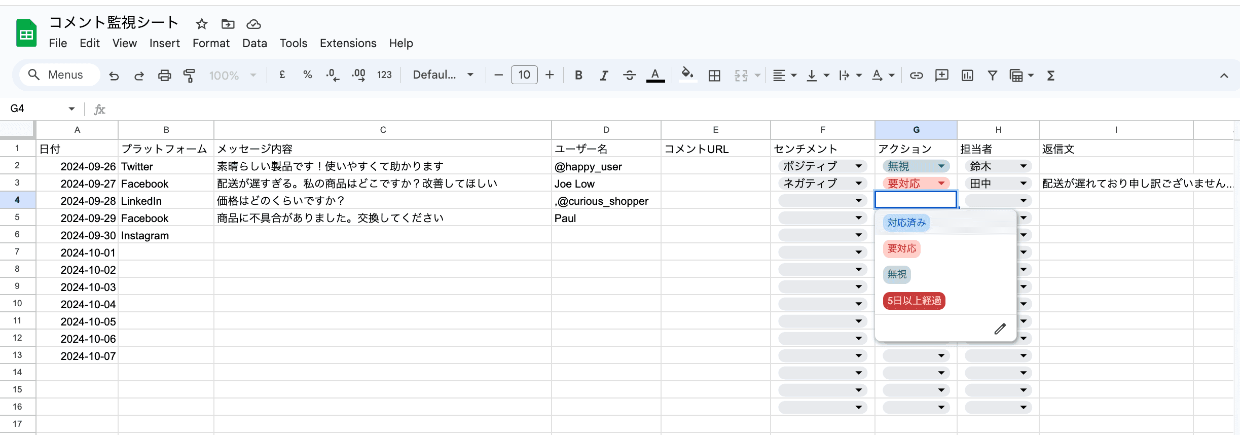 そして、対応者である担当者の名前、コメント元に直接アクセスできるURLのカラムも作って良いでしょう。
