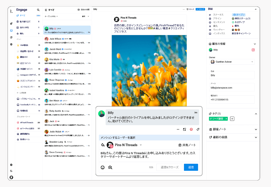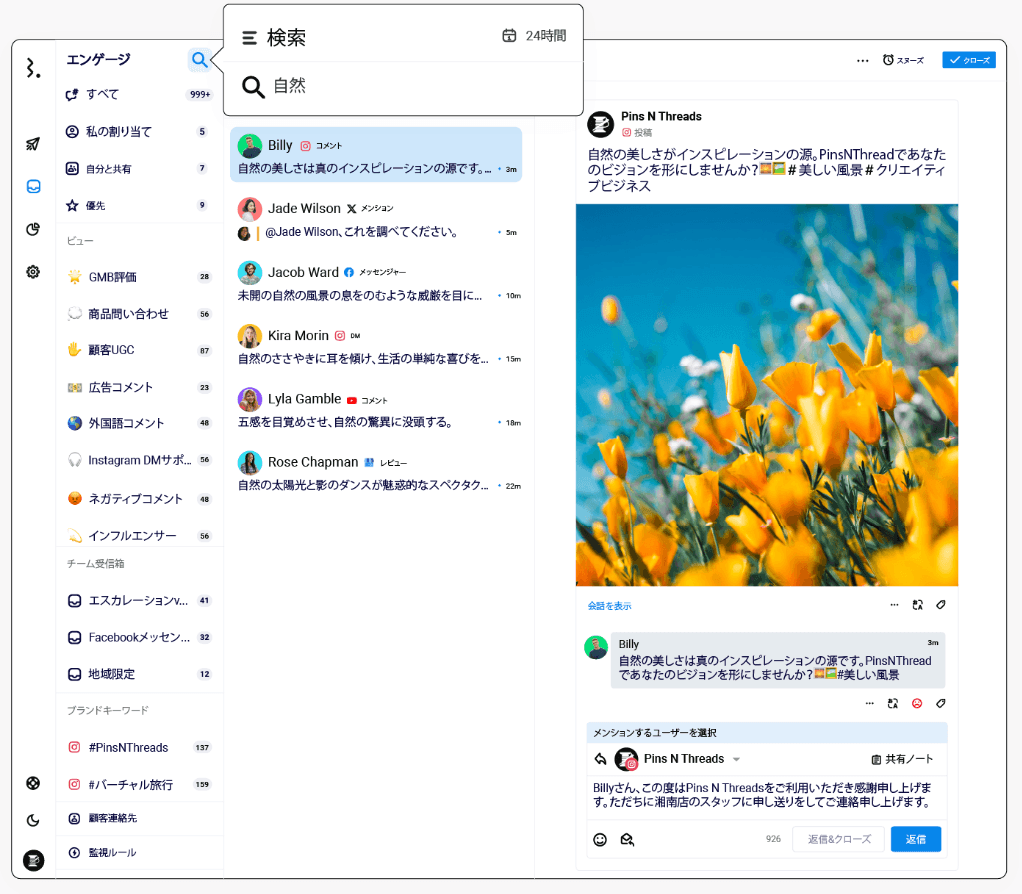 異なるプロファイルの全てのソーシャルチャンネルからのコメントを単一のダッシュボードで監視・対応する