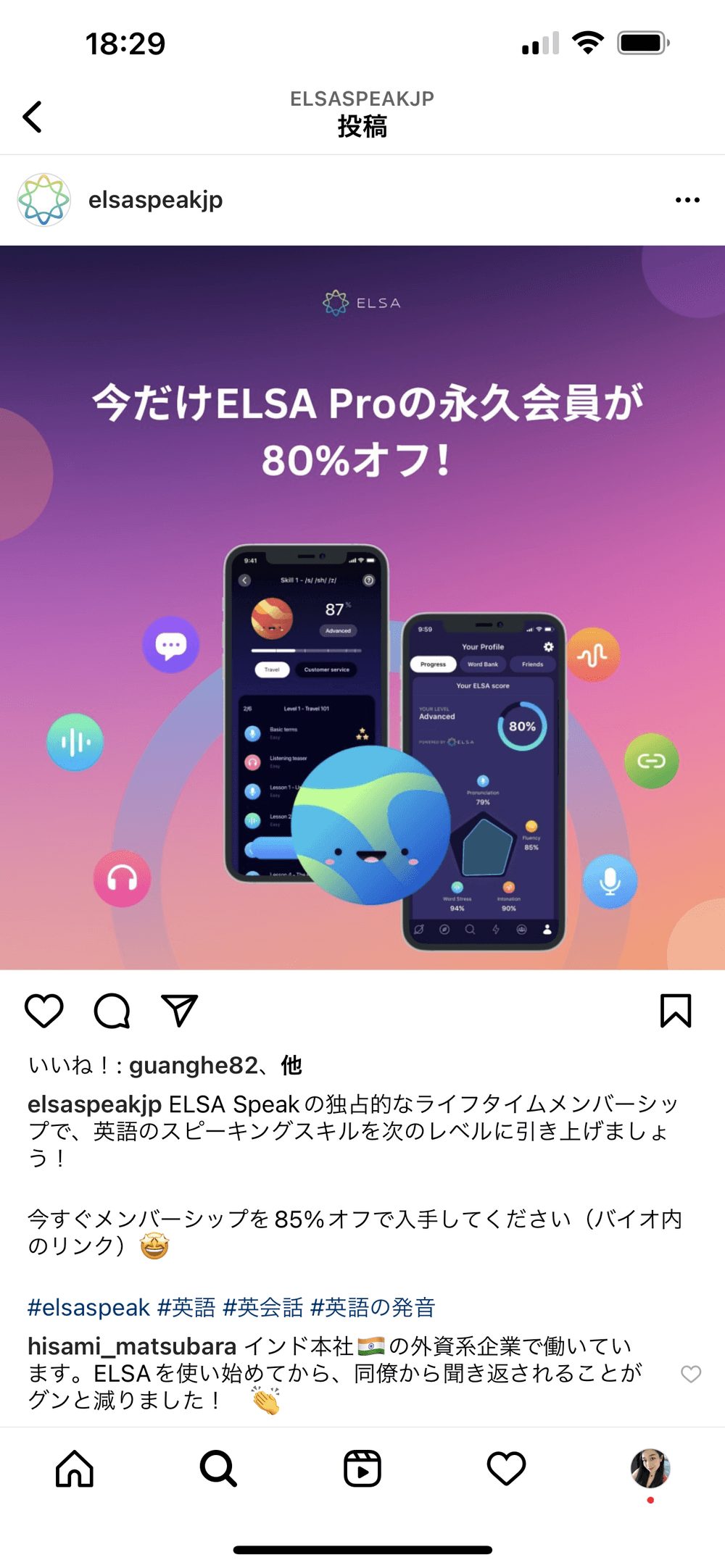英語発音矯正アプリケーションELSAのInstagramアカウントへのコメント
