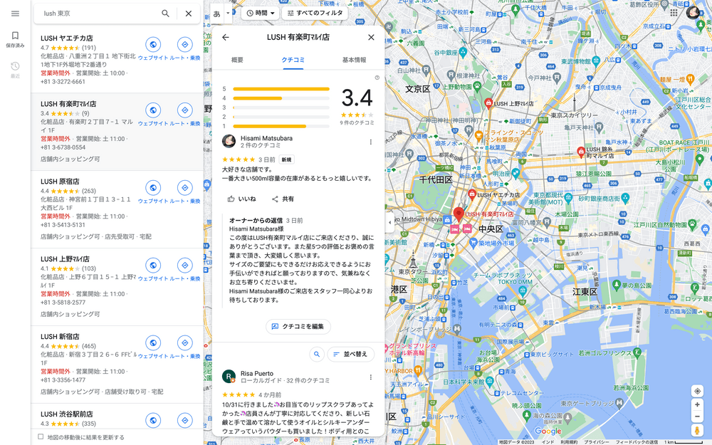 顧客からのフィードバックはGoogleビジネスプロフィールやFacebookページへのビジター評価など、「評価前提」のエンゲージメントも拾うべき重要な要素です。 特に全国展開する店舗型ビジネスを運営している場合、顧客は店舗へ直接フィードバックをするか、「本社に連絡しよう」と公式アカウントに店舗での体験をシェアするかはまちまちです。 店舗ごとに確認するタイミングが異なり、対応へのタイムラグを防ぐことも、SNS監視の大事な部分です。