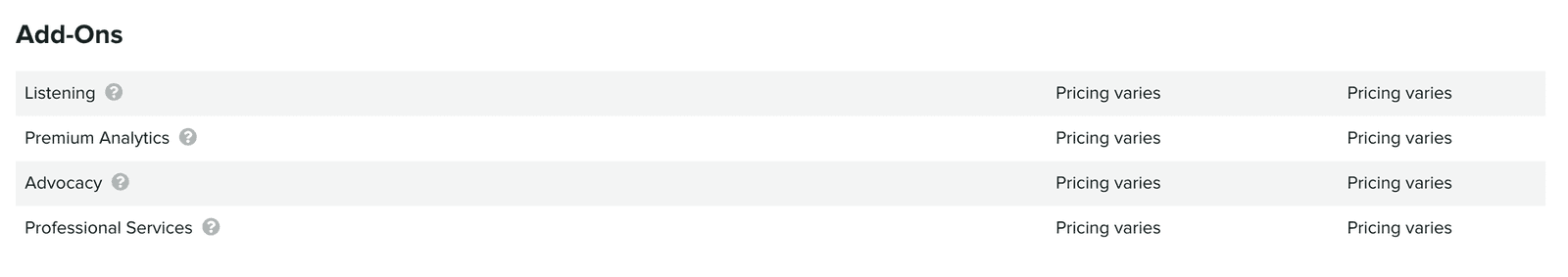 Sprout Socialは、どのアドオンの価格も公開していません。私たちが掲載している価格(月額999ドル)は、これらのアドオンに一般的に支払われている平均価格です。