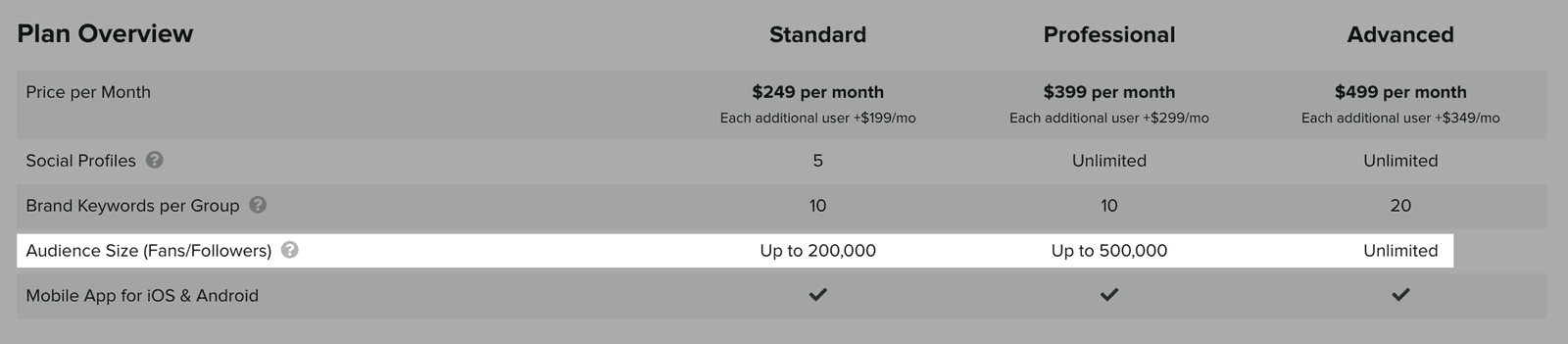 ソーシャルプロファイルのオーディエンスサイズに制限がない場合は、アドバンスドプラン(ユーザーあたり月額499ドル)を選択する必要があります。