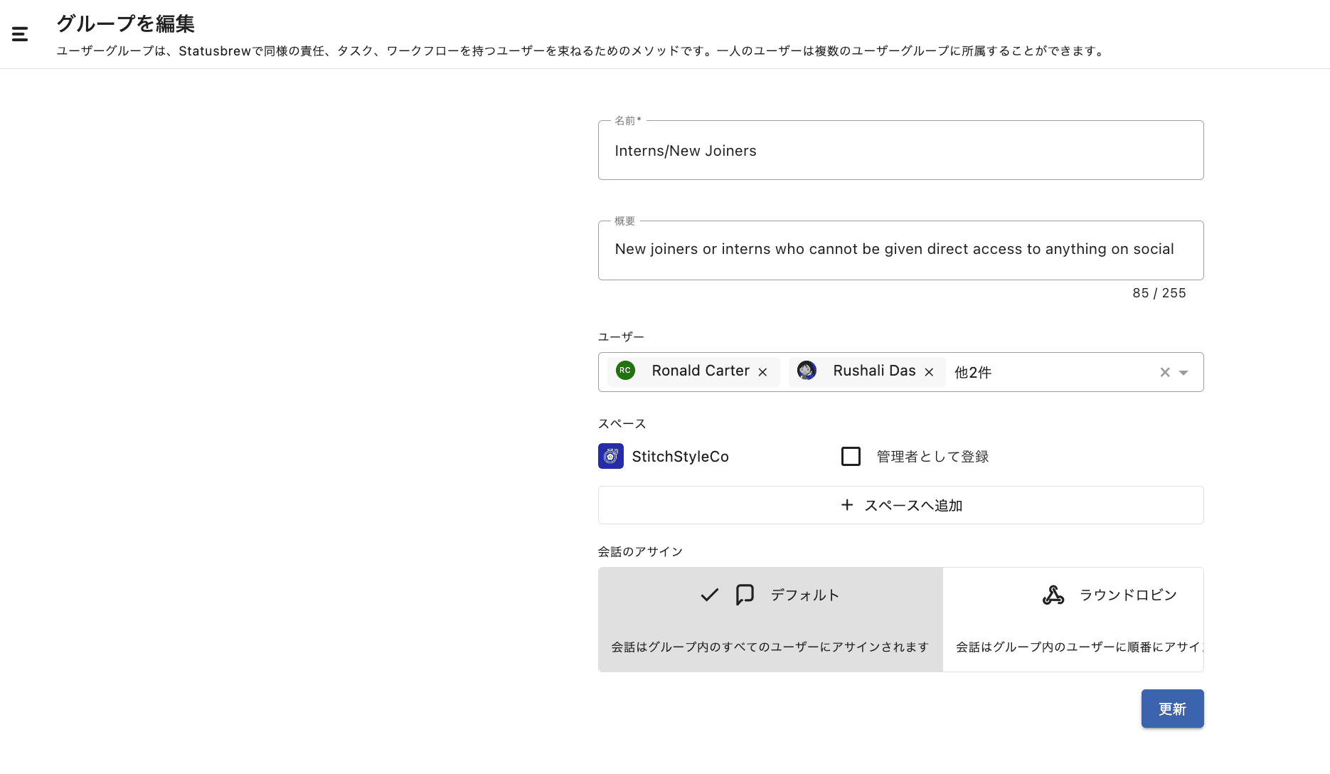 「コンテンツ承認チーム_a」グループ のように、役割でグループ化することで、権限管理の工数を大幅に削減できます。さらにStatusbrewではグループ化することで、一括の作業アサインやこの本権限設定も一度で行うことができます。そのため、グループ内でのユーザー(従業員)の入社退職の管理も1クリックで完了します。