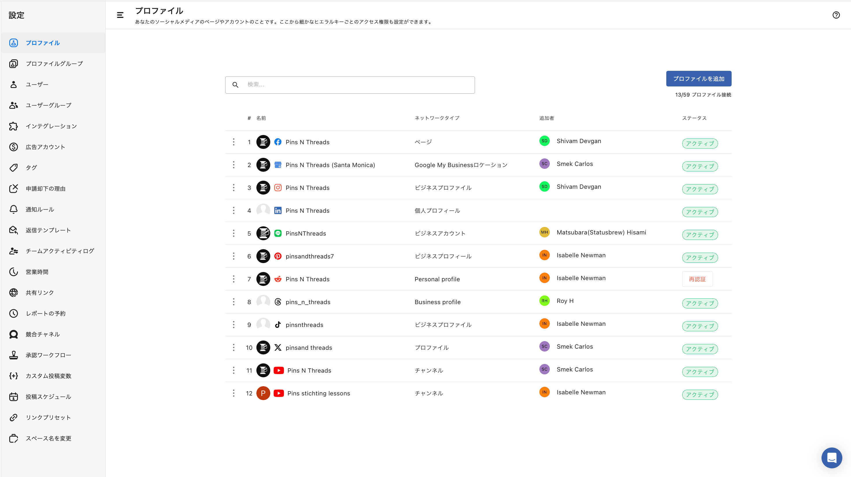 設定からプロファイルの接続を行います。Statusbrewでは、X(Twitter)、Instagram 、Facebook、Googleビジネス、Threads、TikTok、YouTube、LINEなど14種類のチャネルに対応しています。