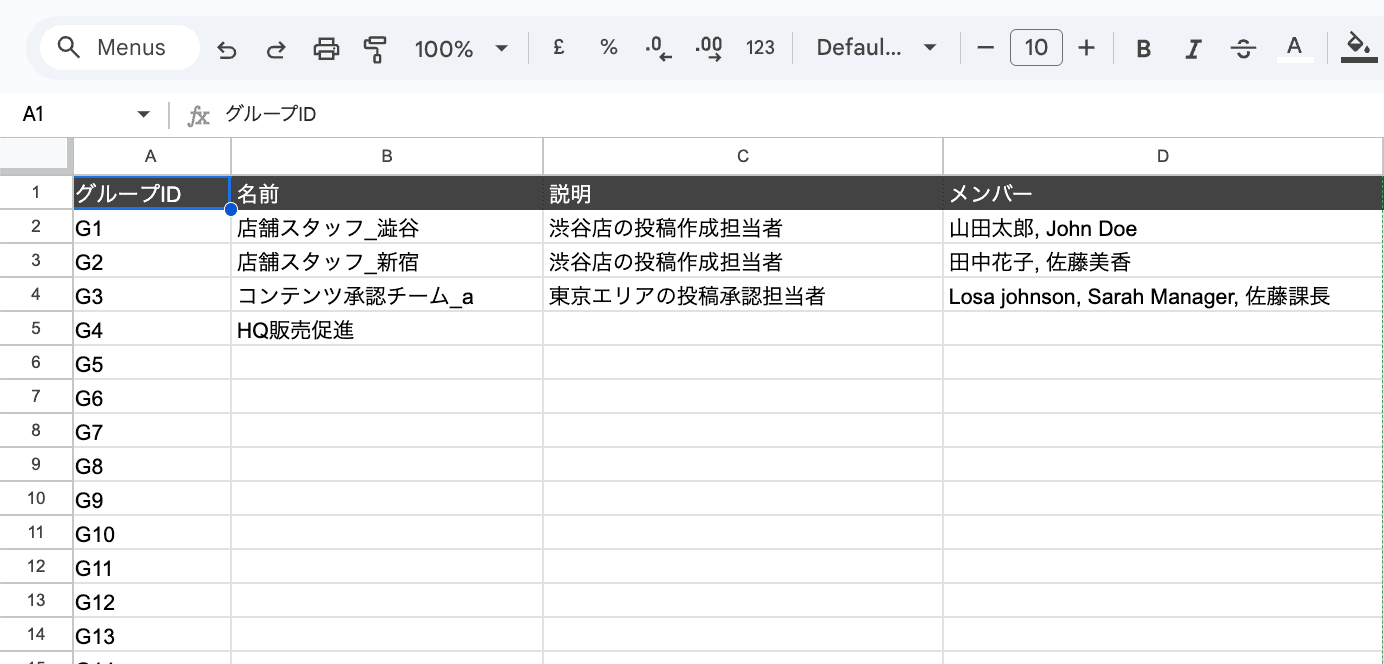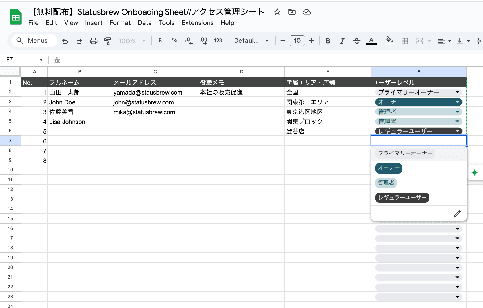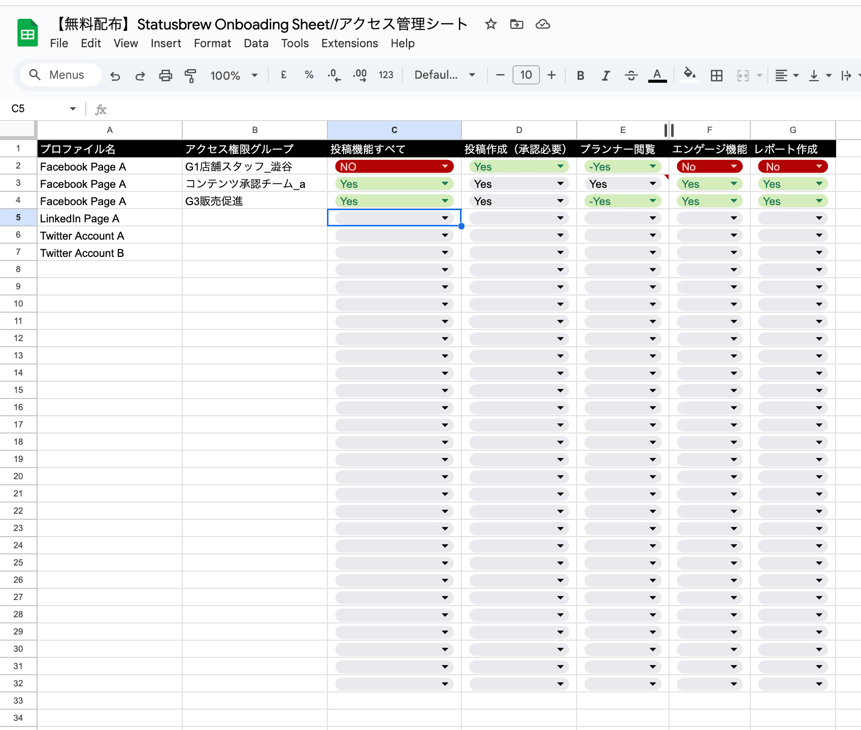 4つのシートを1から埋め込んでいくことで、自動的にStatusbrewでのアカウントセットアップが完了するだけではなく、企業が今後、どの管轄にどこまでの権限を与えたいのか?を明確にします。