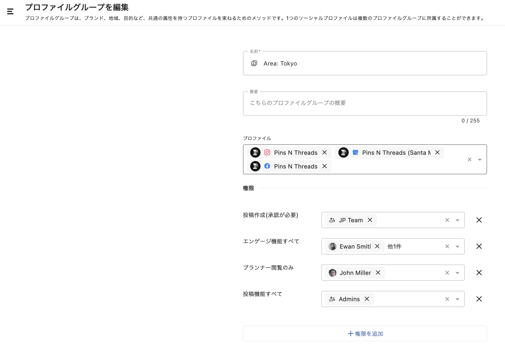 コンテンツ承認チームは「投稿機能すべて」の権限 というように、細かな権限設定が可能です。