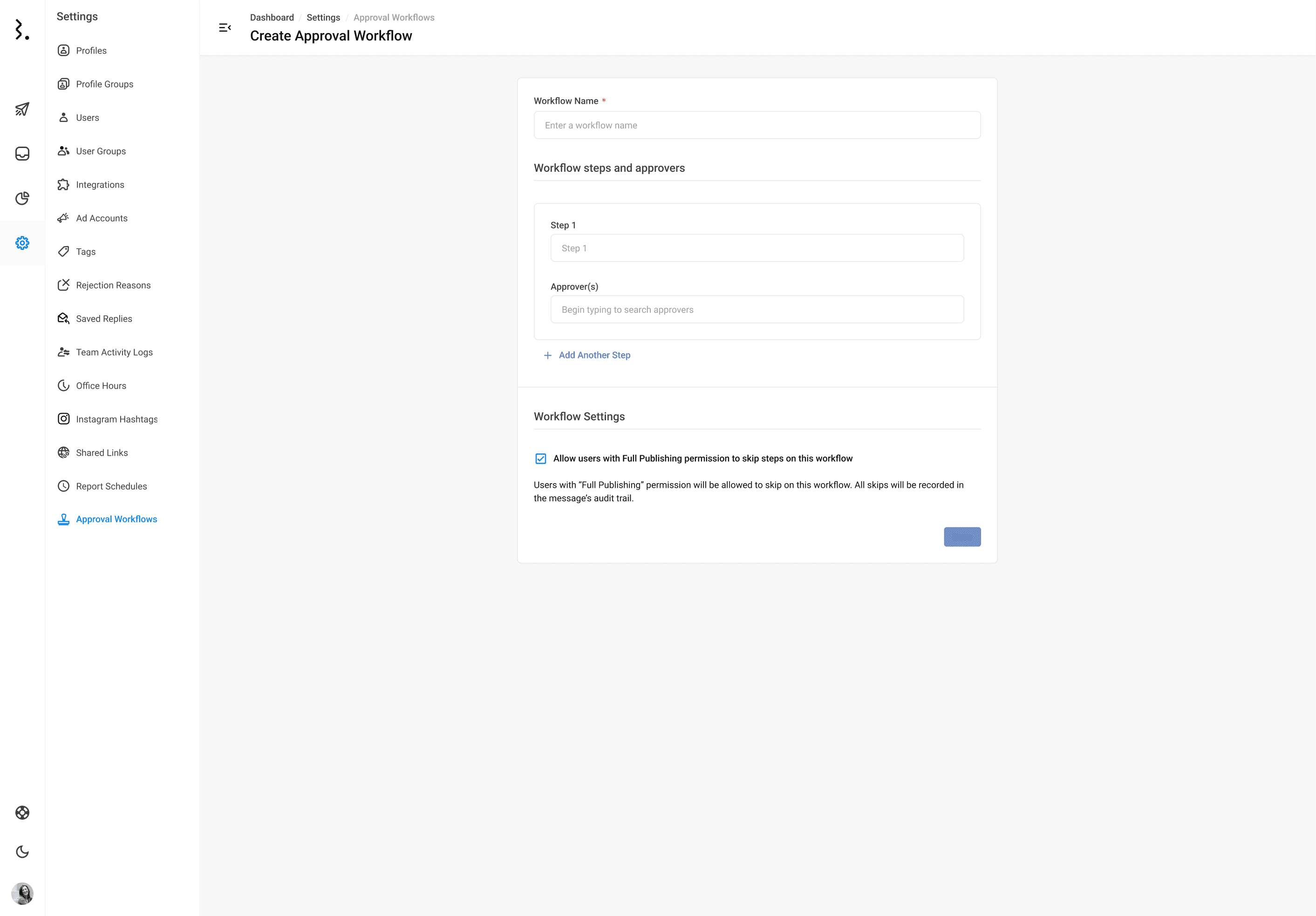 事業や店舗によってソーシャルメディアコンテンツの確認ルールと段階が異なる場合、カスタムで好みの承認段階を作成してワークフローに反映できるようになりました。