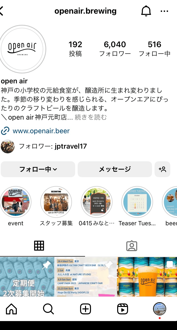 IB BREWINGはEコマース販売を主軸にカンボジアに初の海外進出を果たしています。Open airは、世界五大ビール品評会の一つである「インターナショナル・ビアカップ2022」で金賞を受賞、神戸の中心元町に自社ブルワリービールを飲むことができる自店舗タップルームをオープンさせています。このように戦略自体は異なるように思われますが、ソーシャルメディアマーケティングを行う上で、インスタグラムのフォロワー数投稿数では約3倍ほどになっているためどのような経過を辿っているかベンチマークをするにふさわしい企業だと考えられます。