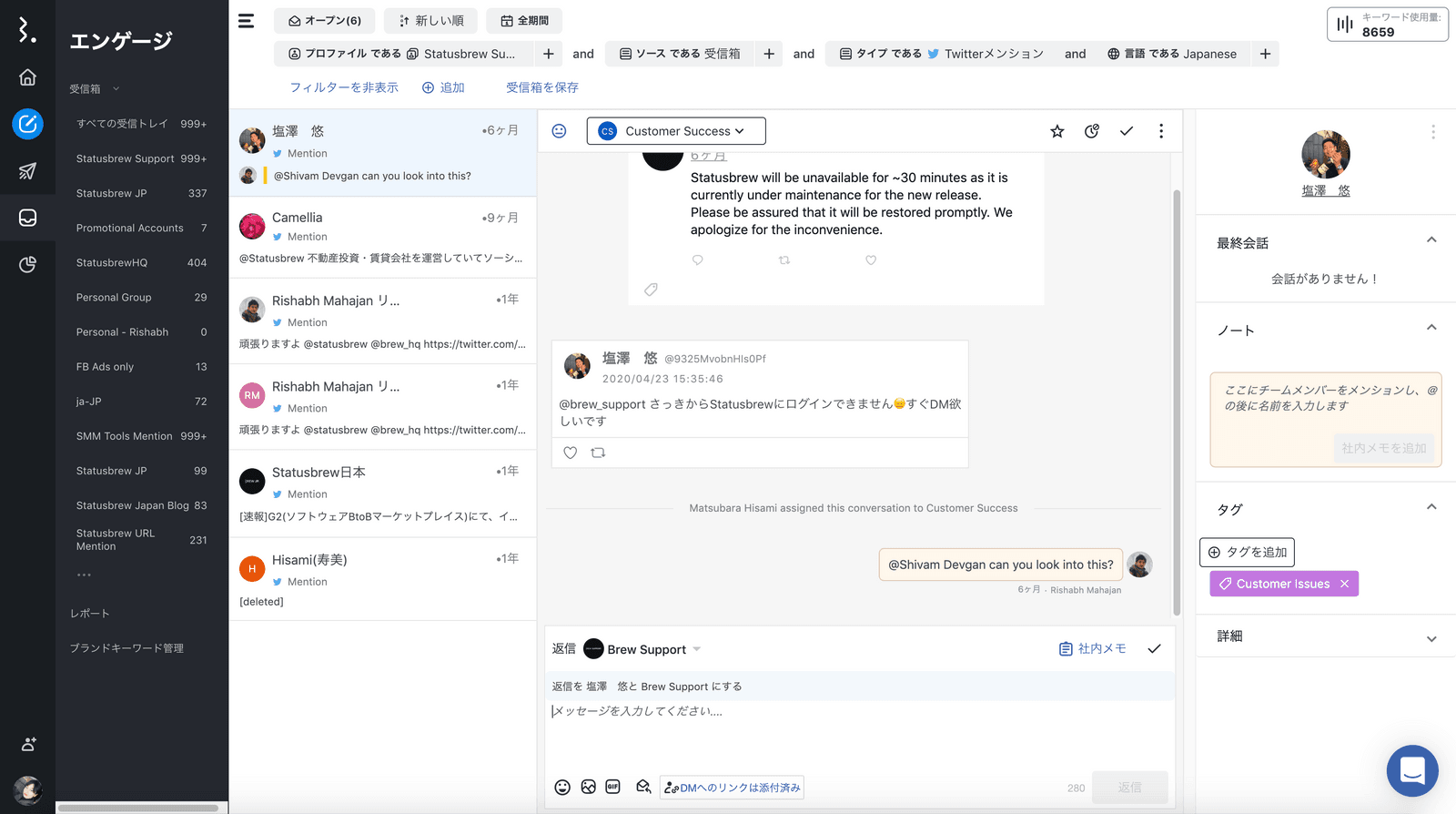 その中でもエンゲージ機能は、 オーディエンス、ユーザーとのコミュニケーションを図るためのツールです。 Statusbrewではソーシャルメディア上のカスタマーケアを重要視しているとともに、 “If you’re not engaging, you ‘re not growing.”(エンゲージしていなければ、ソーシャル上の成長はない)を提唱しています。なぜなら特にInstagramはアルゴリズムの変化が激しく、アカウントの成長が思うように行かなかったりと厳しい局面を迎えている企業様、ブランド様、クリエイター様(アーティスト)が日本に限らず世界的に多いです。そんな中で結局鍵になるのはいつでもいかにユーザーに対してエンゲージしているか?にたどり着きます。