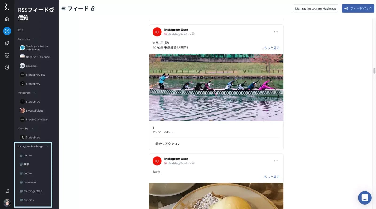左の薄いブルー色の枠の中が登録したInstagramハッシュタグです。
