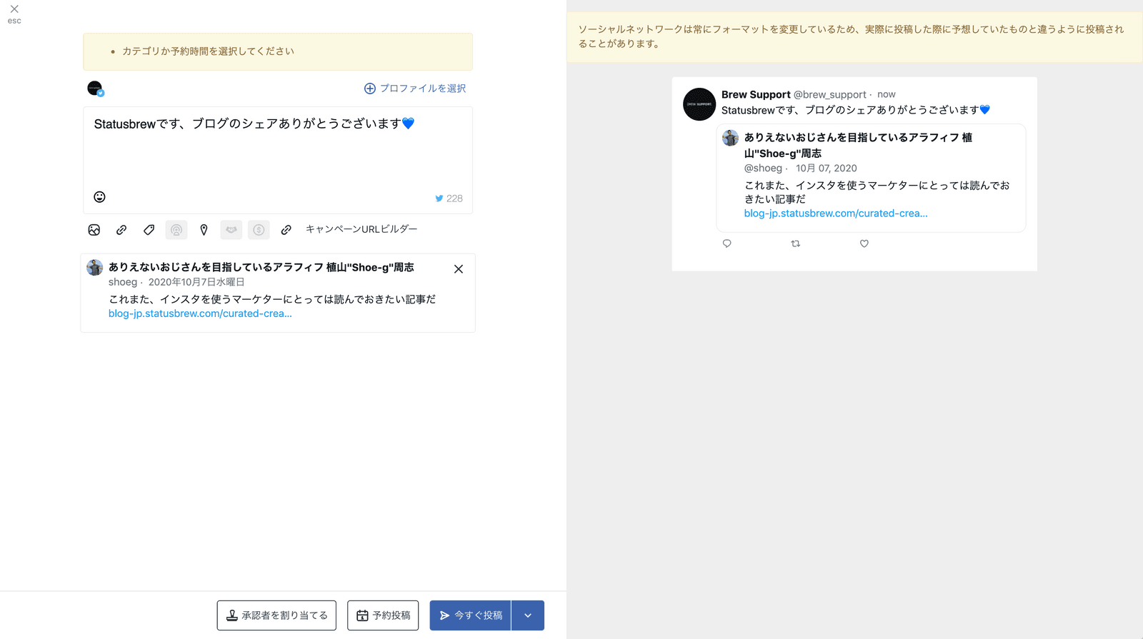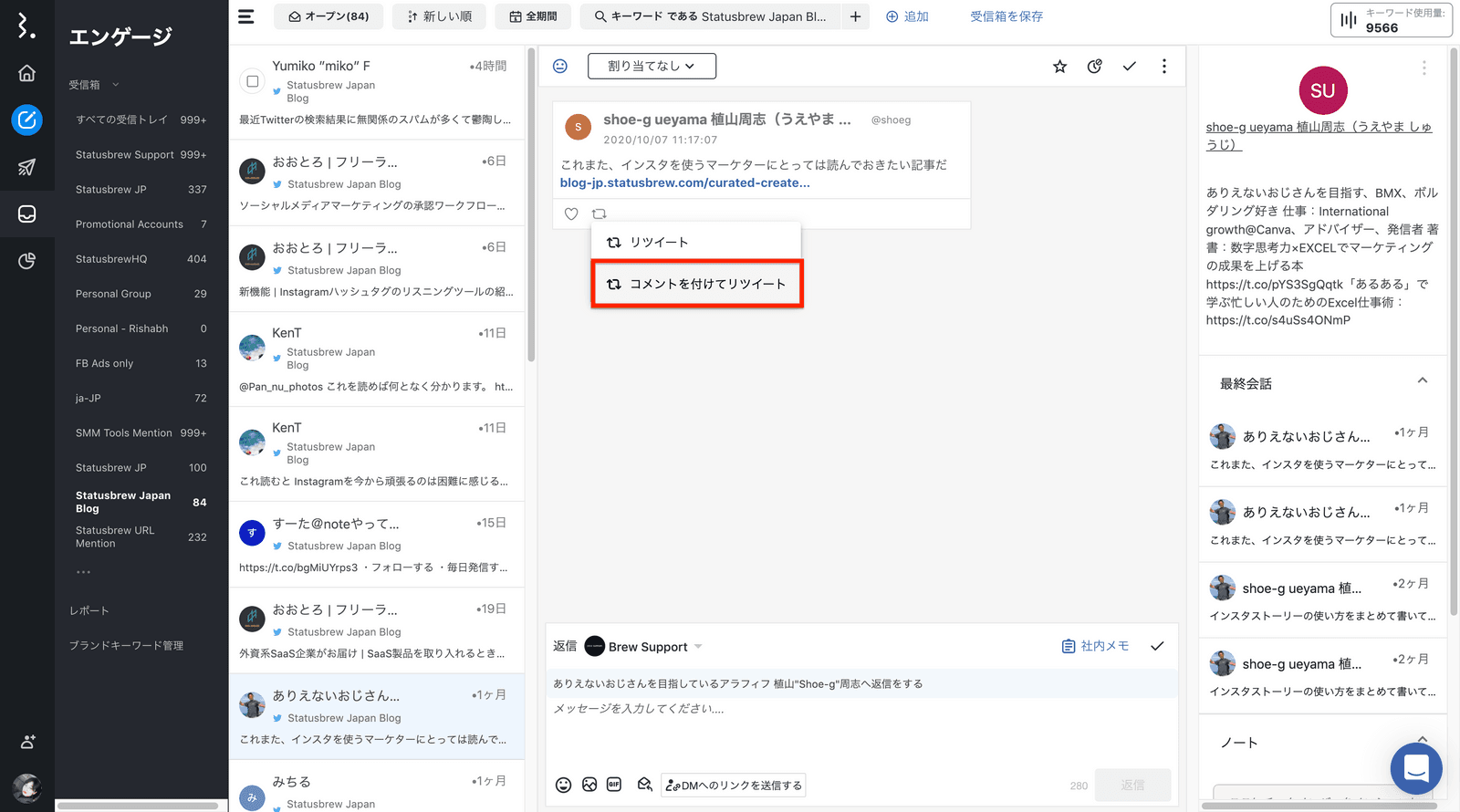 また、Twitterのリスニングキーワードも登録して、良いUGCはリツイートや引用リツイートの予約投稿もStatusbrewから可能です。