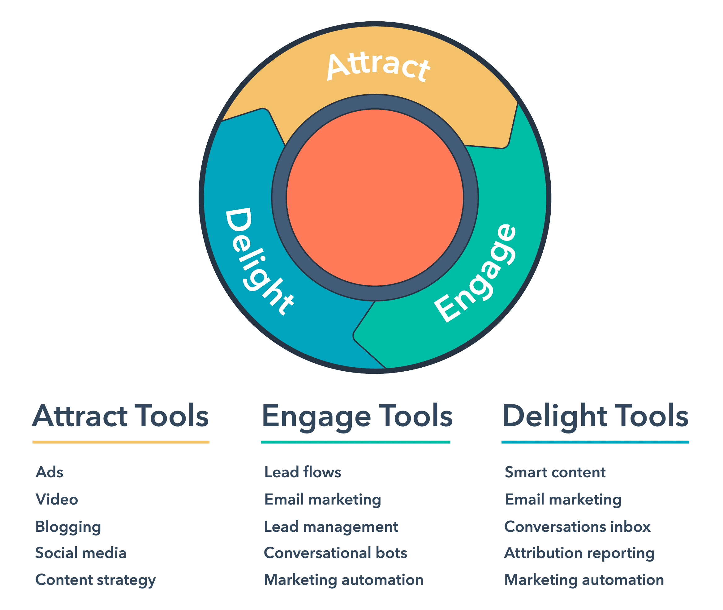 インバウンド手法のプロセスは、Attract(惹きつける)、Engage(信頼関係を築く)、 Delight(満足させる)という3つのステージで構成され、各ステージにおいて顧客に付加価値を提供することが重視されます
