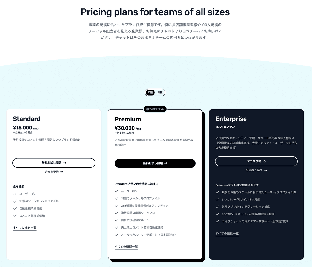 クライアントの代わりにソーシャルメディアを運用代行する代理店様にはPremiumプランの購入をいただきます。
