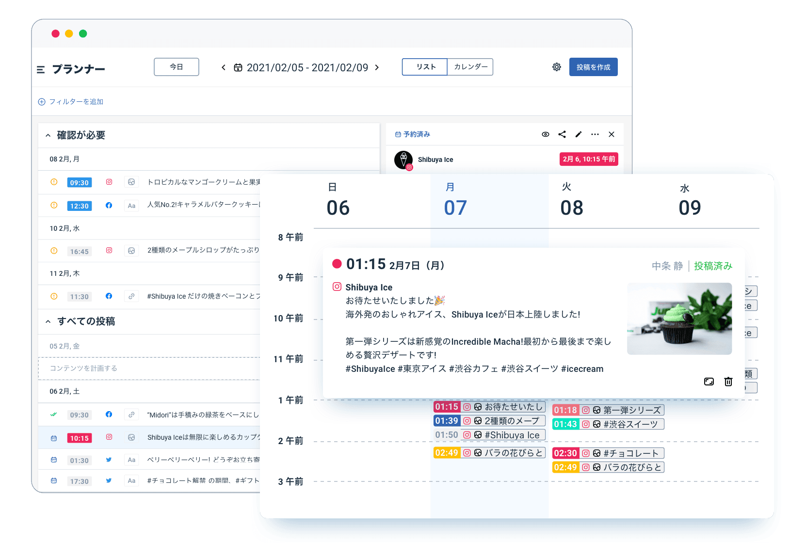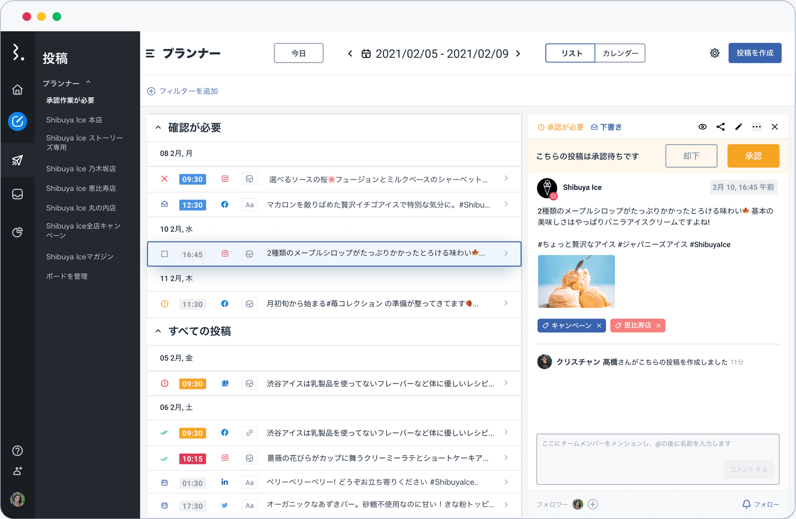 アップグレードされた視覚的なカレンダーです。下書き状態で進捗が見られない投稿、ダブルチェック待ちの投稿、予約済みの投稿、公開済みの投稿と様々ありますが、リスト形式からワンクリックでチームとシェアしたり、手を加えたりできます。