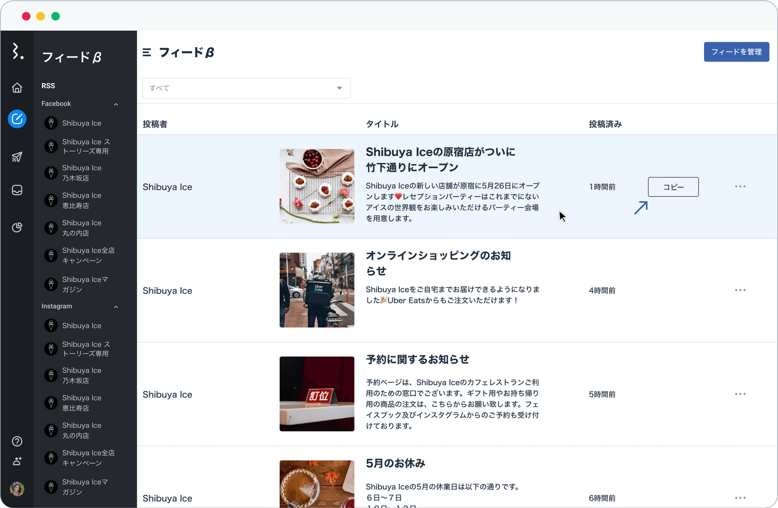 Statusbrewには業界界隈のニュース記事や自社ドメインのブログコンテンツをソーシャルにワンクリックで予約投稿できるようにRSSフィードを設定する機能が備わっています。業界に関わるニュース、プレスリリース、自社の商品・サービス紹介などを、リアルタイムでRSSフィードに取得します。