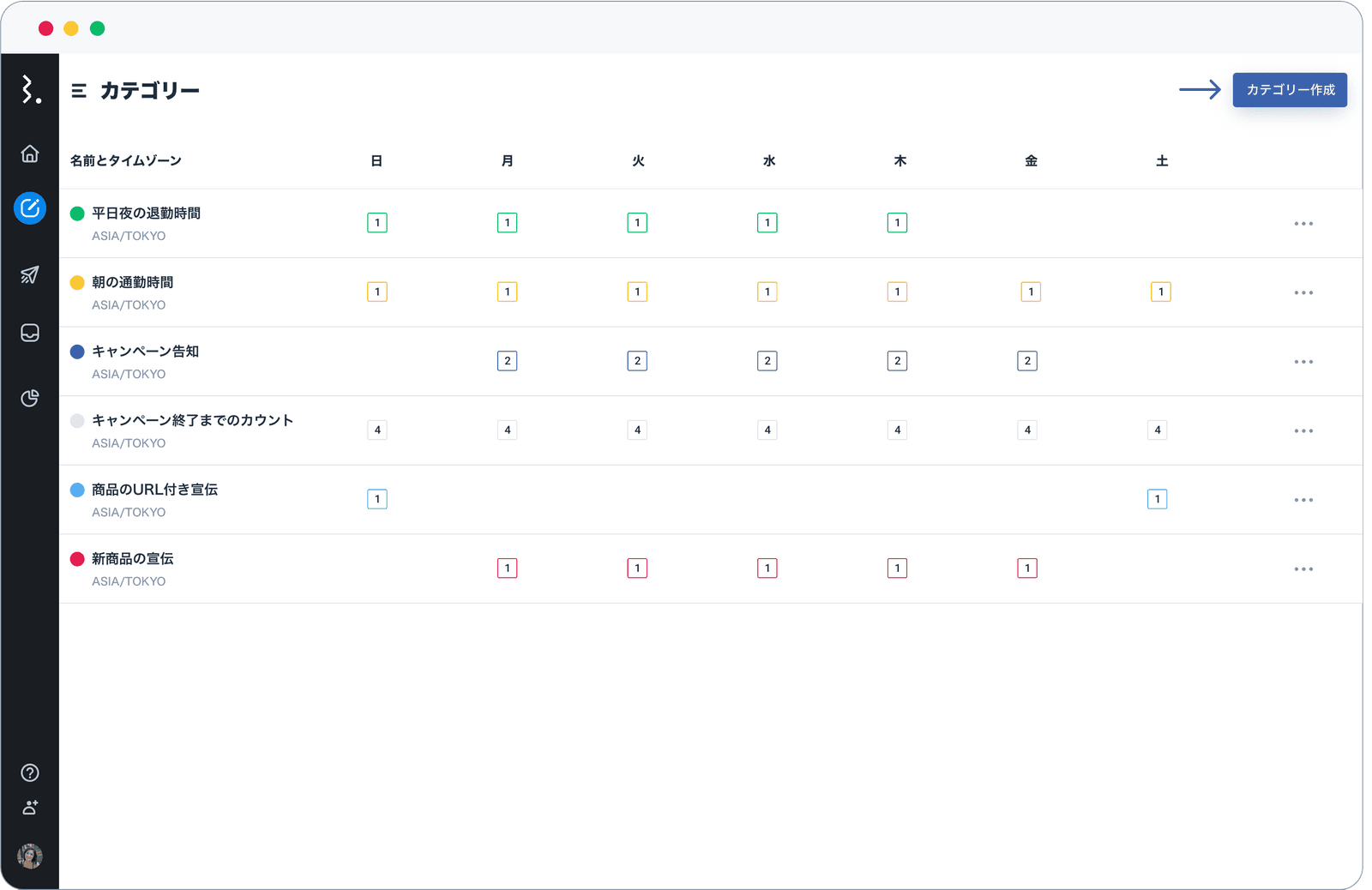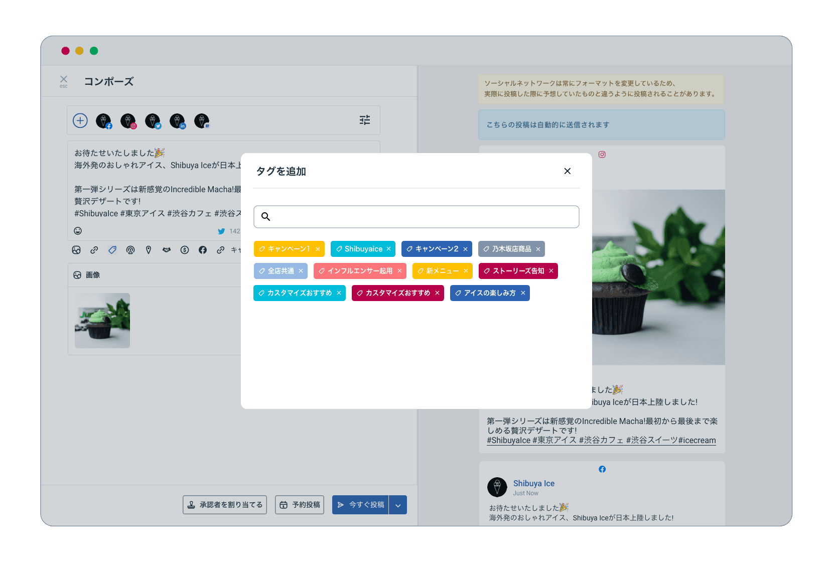 投稿にタグを付けるカテゴリを作成し、必要なときに簡単にタグごとの投稿を見つけられるようにします。さらに、タグをカテゴリー化し、保存しておけば同じような投稿を複製して再度投稿していくこともできます。