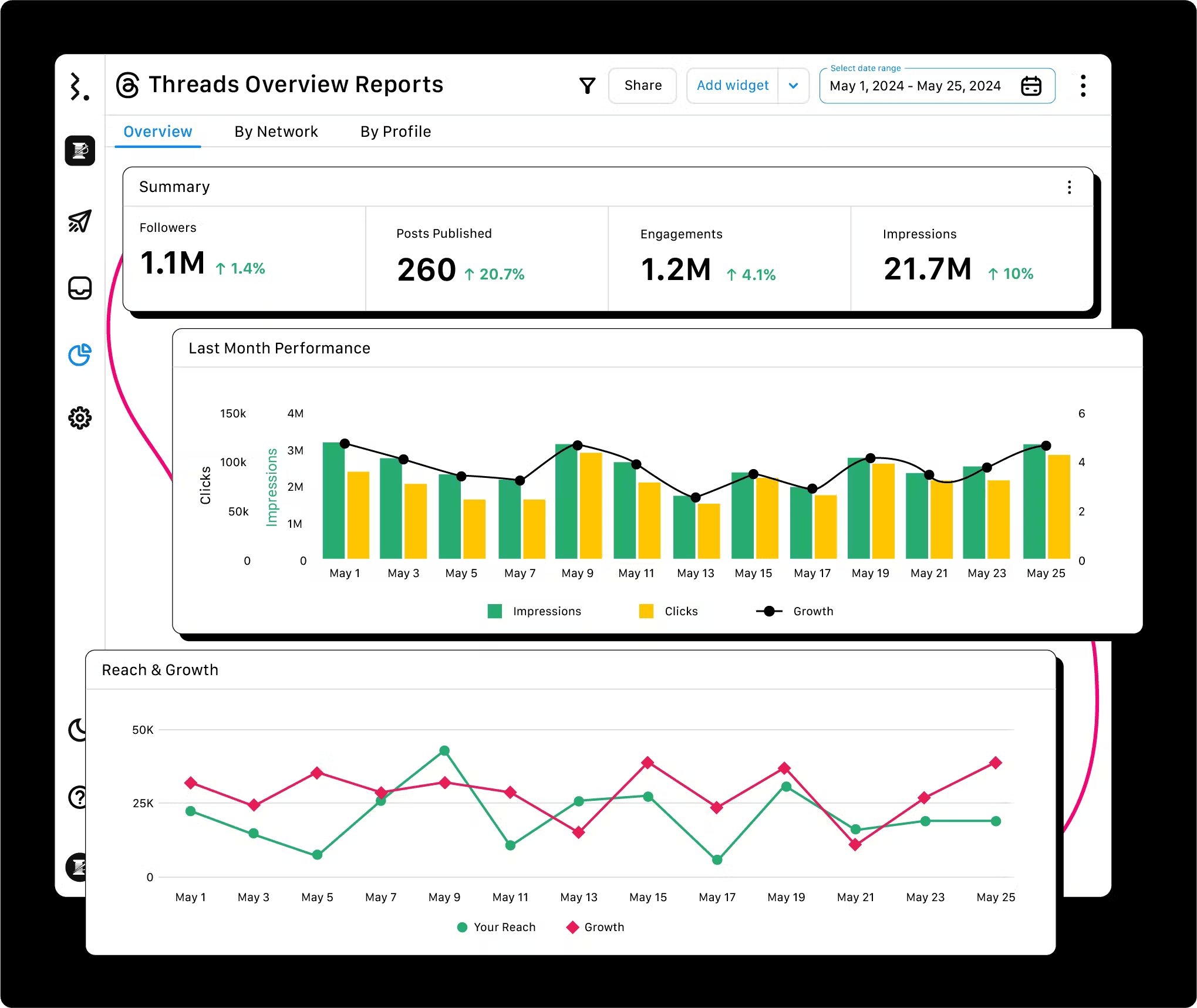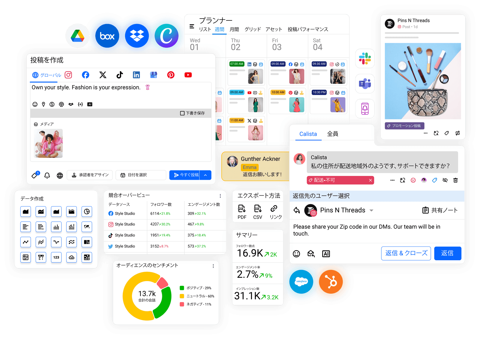 Instagram、Facebook、TikTok、Pinterest、YouTube、LinkedIn、Googleビジネスプロフィールなどの他のプラットフォームのコンテンツと合わせて、包括的なソーシャルメディアコンテンツカレンダーを作成してThreadsのコンテンツをチームと計画できます。