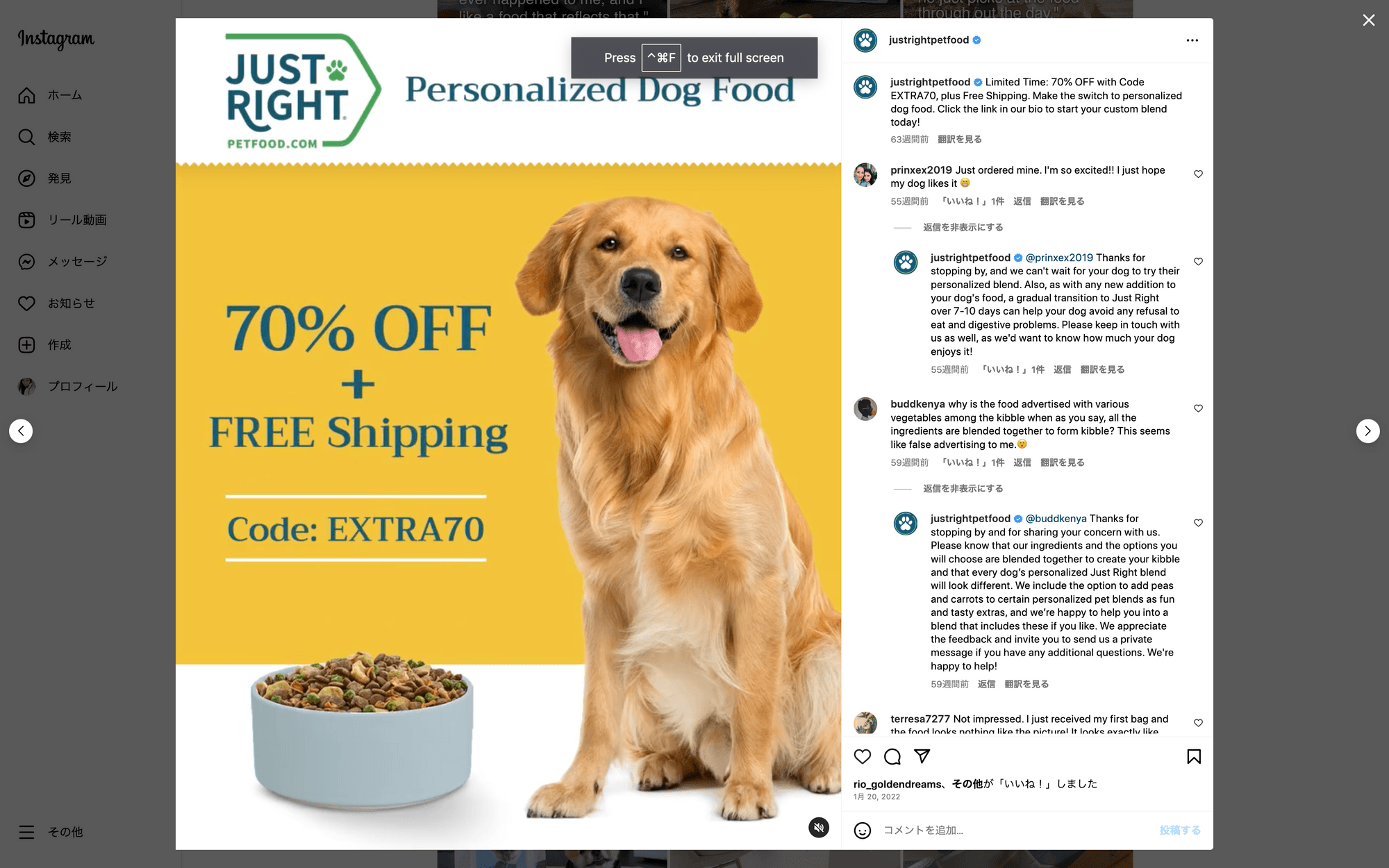 アメリカのペットフード専門オンラインストアのInstagramアカウントへのコメントとその返信