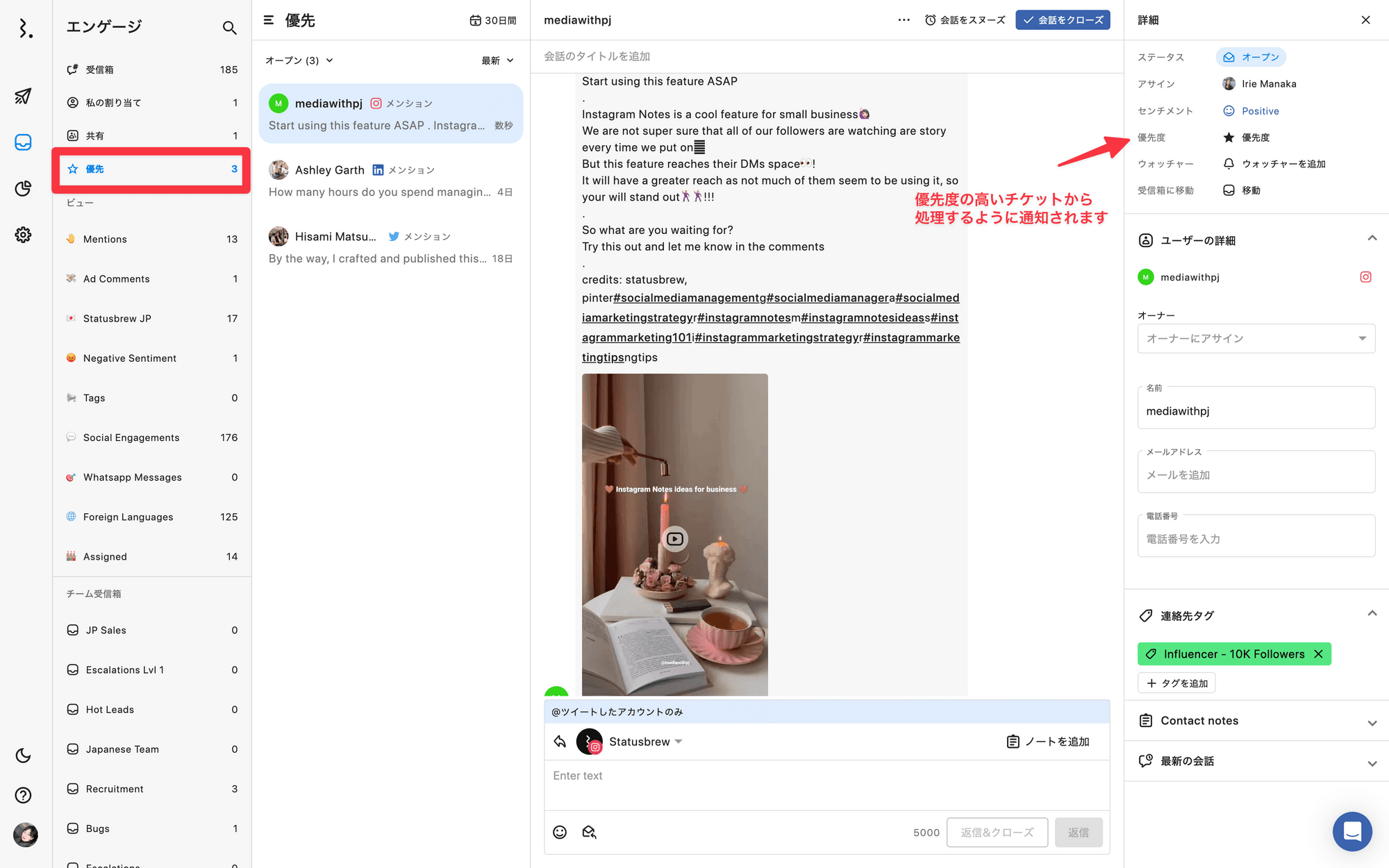 整理と優先順位付け: チケット管理は、ソーシャルメディア上の顧客からのお問い合わせや苦情、ポジティブなフィードバックを整理し、対応の優先順位をつけるのに何よりも友好的です。これにより、緊急性の高い問題や優先順位の高い問題に迅速に対応し、お客様の悩みを放置することがなくなります。
