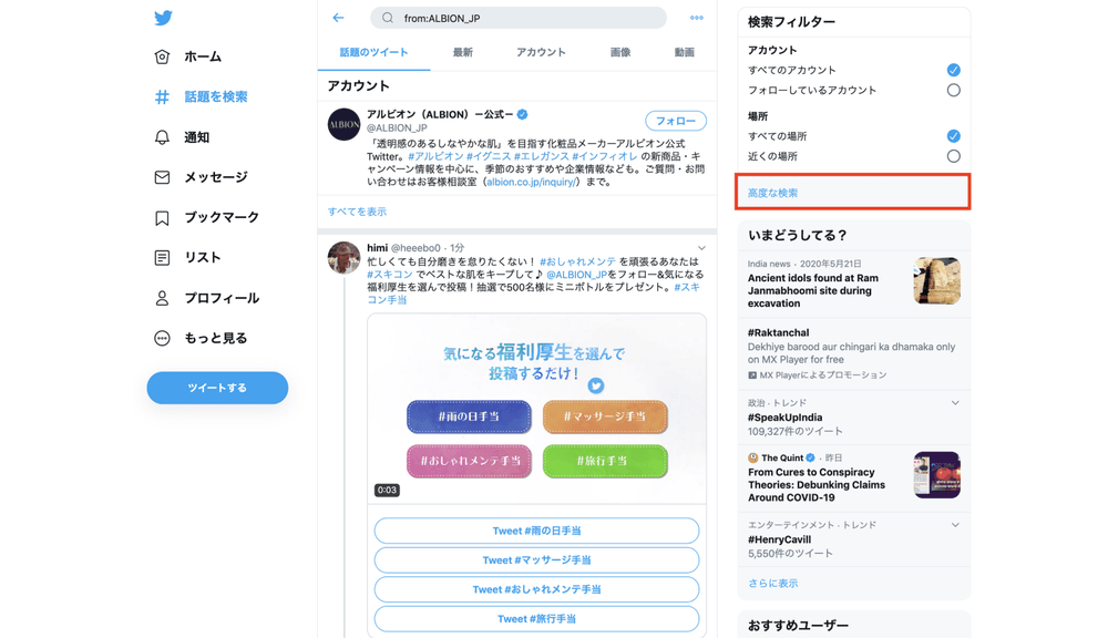 安全と思われる、不適切だと判断されていないツイートのみを検索します。さらにセキュリティを求める場合、検索の際にfilter:followsを加えることで、検索の対象を自分がフォローしているアカウントに限定することもできます。