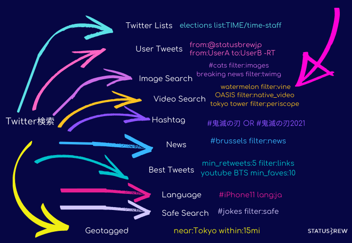 from:ツイッターのユーザー名と検索すると、特定のユーザー内のツイートに絞って検索することができます。例えば from:statusbrewjp (私たちStatusbrewの日本支社公式アカウント)