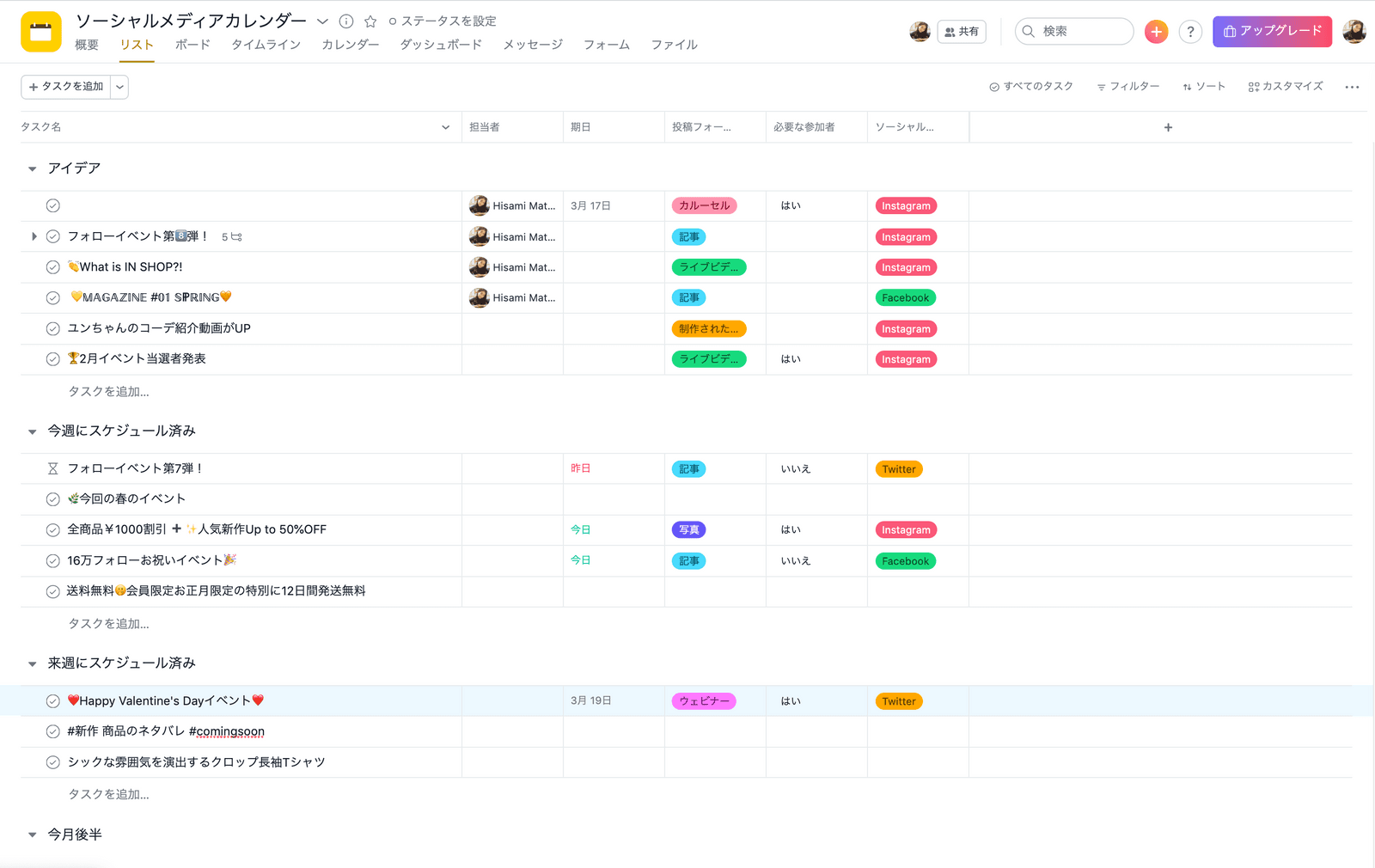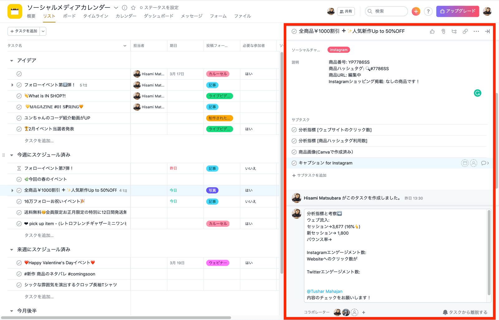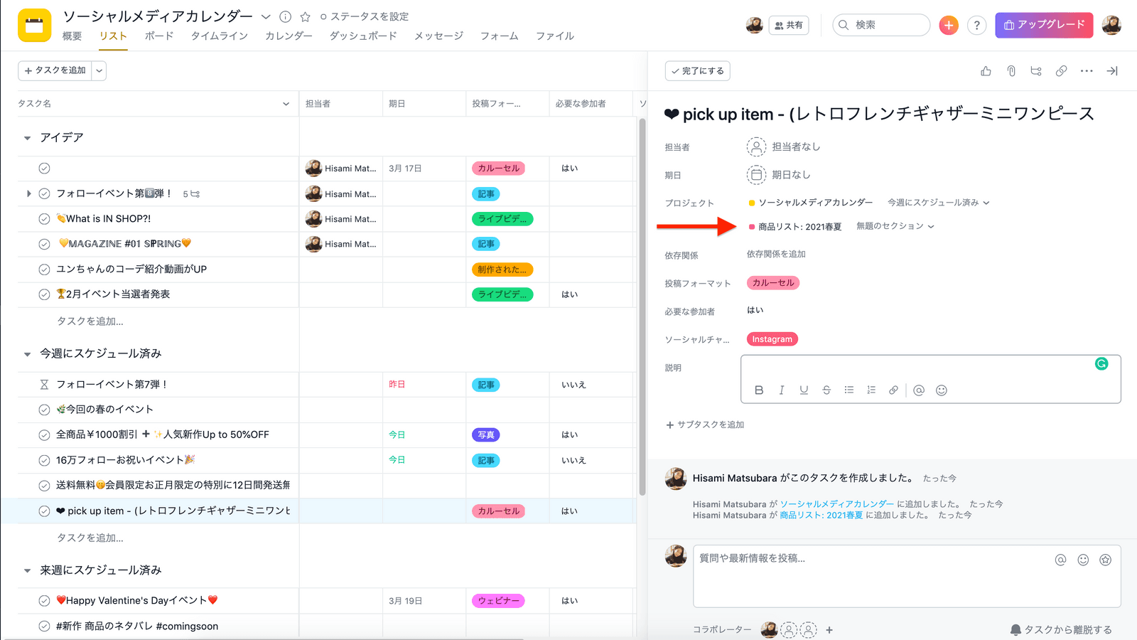 Asanaはそもそも元はと言えばプロジェクト管理ツールです。ソーシャルメディアだけではなく、複数のプロジェクトにタスクを保存できるので、例えば、上記アパレルのEコマース企業だとしましょう。別のプロジェクトとして商品リストやキャンペーンリストを作っておきます。