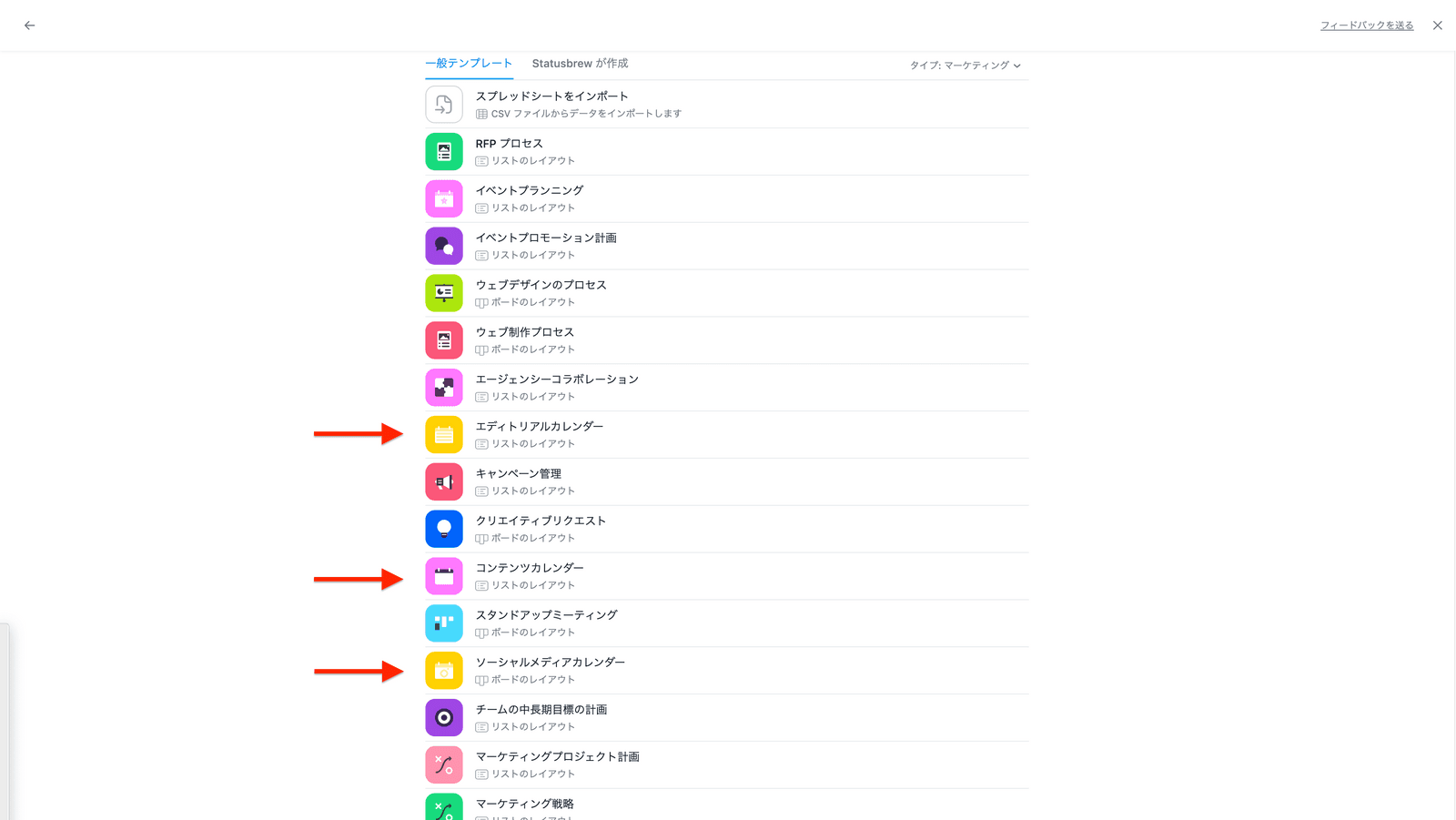 では早速Asanaのソーシャルメディアカレンダーというテンプレートを利用してみましょう。(※エディトリアルカレンダーというSNSだけではなくマーケティング企画としても利用できるテンプレートもありますが、ここではソーシャルメディア用に特化したものを紹介します)