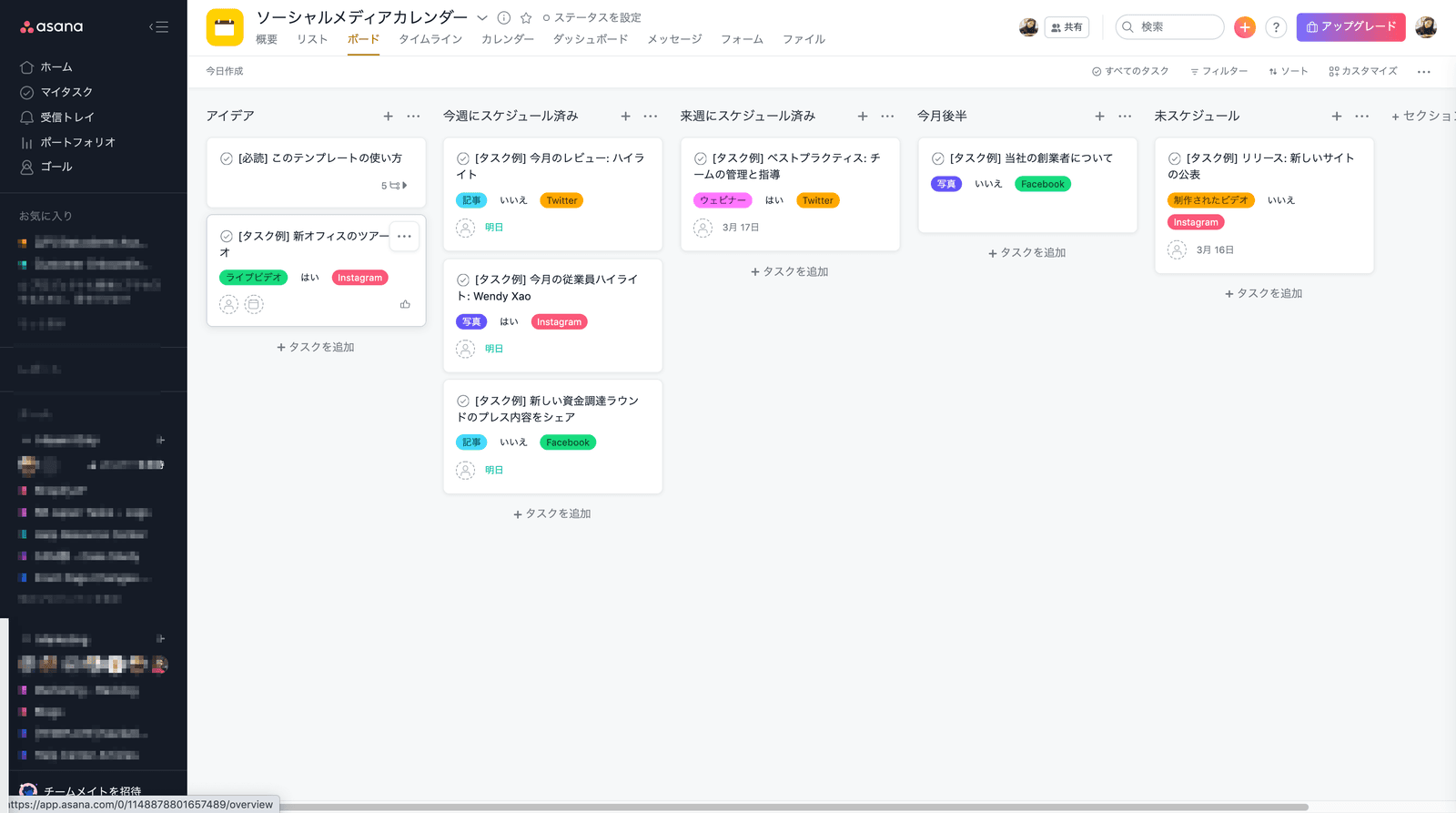 Asana を使うと、どの投稿がいつ、どのチャネルにどのように公開されるのかを明確にできます。逆にどうしてこの投稿計画が立ち往生しているのか、予定通りに公開されていないのかを追求することもできます。SNS向けのマーケティングプランを入念に準備してこそ、フォロワーがある程度増えた先のホンモノのソーシャルメディアマーケティングに繋がります。