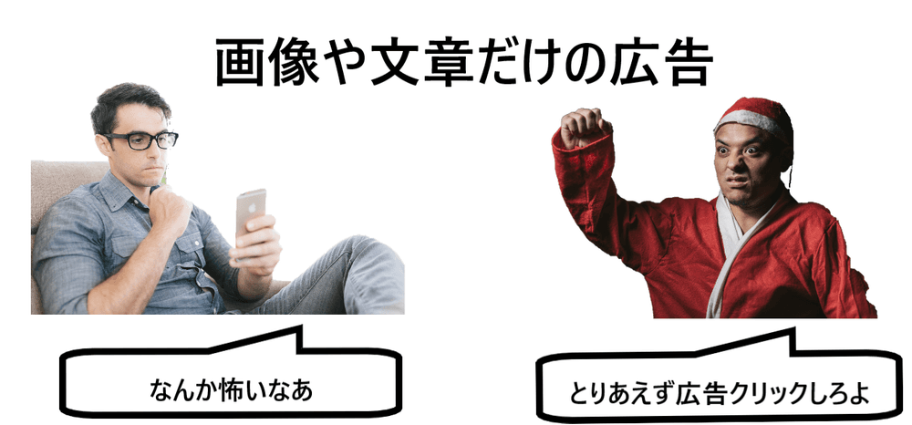 画像だけの広告は、クリックするといきなり企業の製品紹介や、お申し込みのページに飛んでしまう場合がほとんどです。そのためユーザーはなんとなく、「怖い」あるいは「面倒だな」というイメージを抱いてしまい、結果として広告をクリックすることを躊躇いがちです。