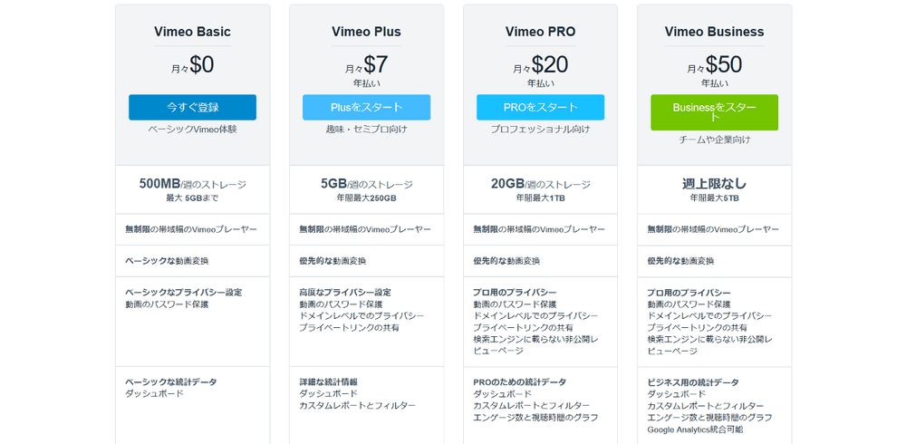 こういった厳しい規約のおかげで、Vimeoは高い芸術性を維持できていると言えます。ちなみにVimeoには無料プランの他にPlus,Pro,Businessと3つの有料プランが用意されており、ProとBusinessのみが企業のプロモーションビデオなど商用利用を可能としています。