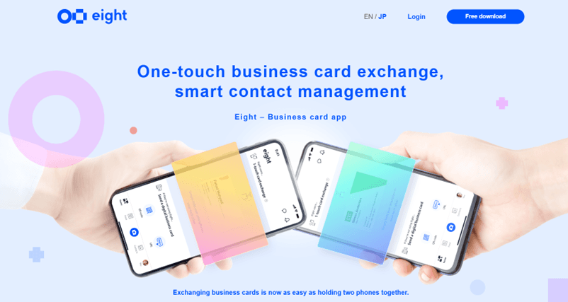 名刺をアプリ1つで一括管理できる、ビジネス用のSNSです。もらった名刺をスマホでスキャンして登録するだけで、名刺交換した相手とはEightを通じてメッセージのやり取りをしたり、相手の転勤・転職などで名刺が変わった際にはそれを通知してくれるそうです。