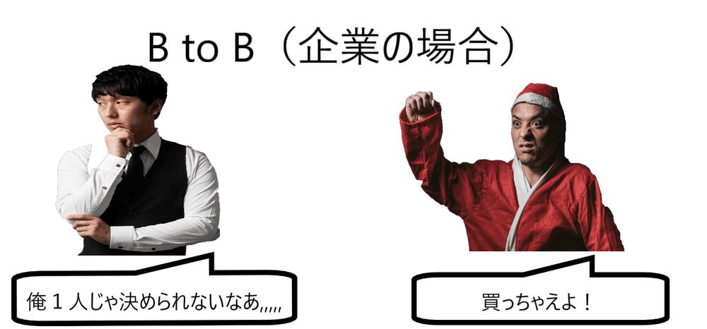 まず企業は、一時の感情で商品を購入しません。企業として何か商品を購入する場合は、予算の決定、商品の選定、リサーチ、商談などのプロセスを経て始めて購入に至ります。