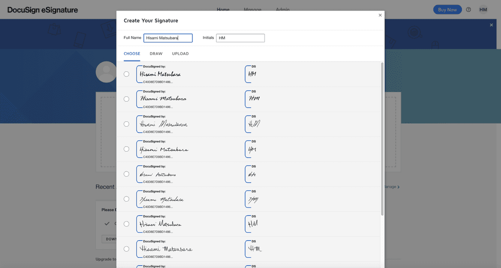 まず自分の署名を作成しておきます。私は自分の筆記に自信がないので自分の名前をタップしただけでデザインしてくれるDocuSignの自動署名生成に頼っています(笑)