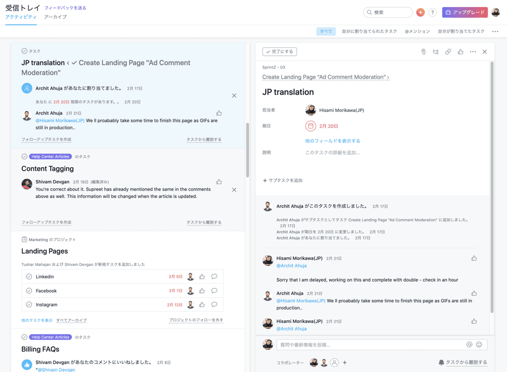 チームメンバーからのタスクの割り振りや私からした質問の回答は「受信トレイ」に全て集約するので見逃すことはありません。