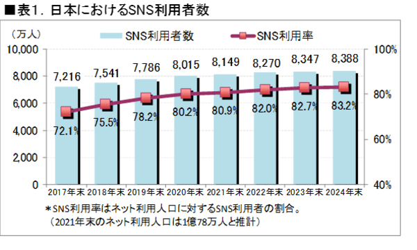 ICT総研が実施した「2022年度SNS利用動向に関する調査」によると、日本のSNS利用者は8,270万人を超えており、SNS普及率は82%にも及びます。微増ではありますが日本でも今なお利用者数、利用率共に高まっています。
