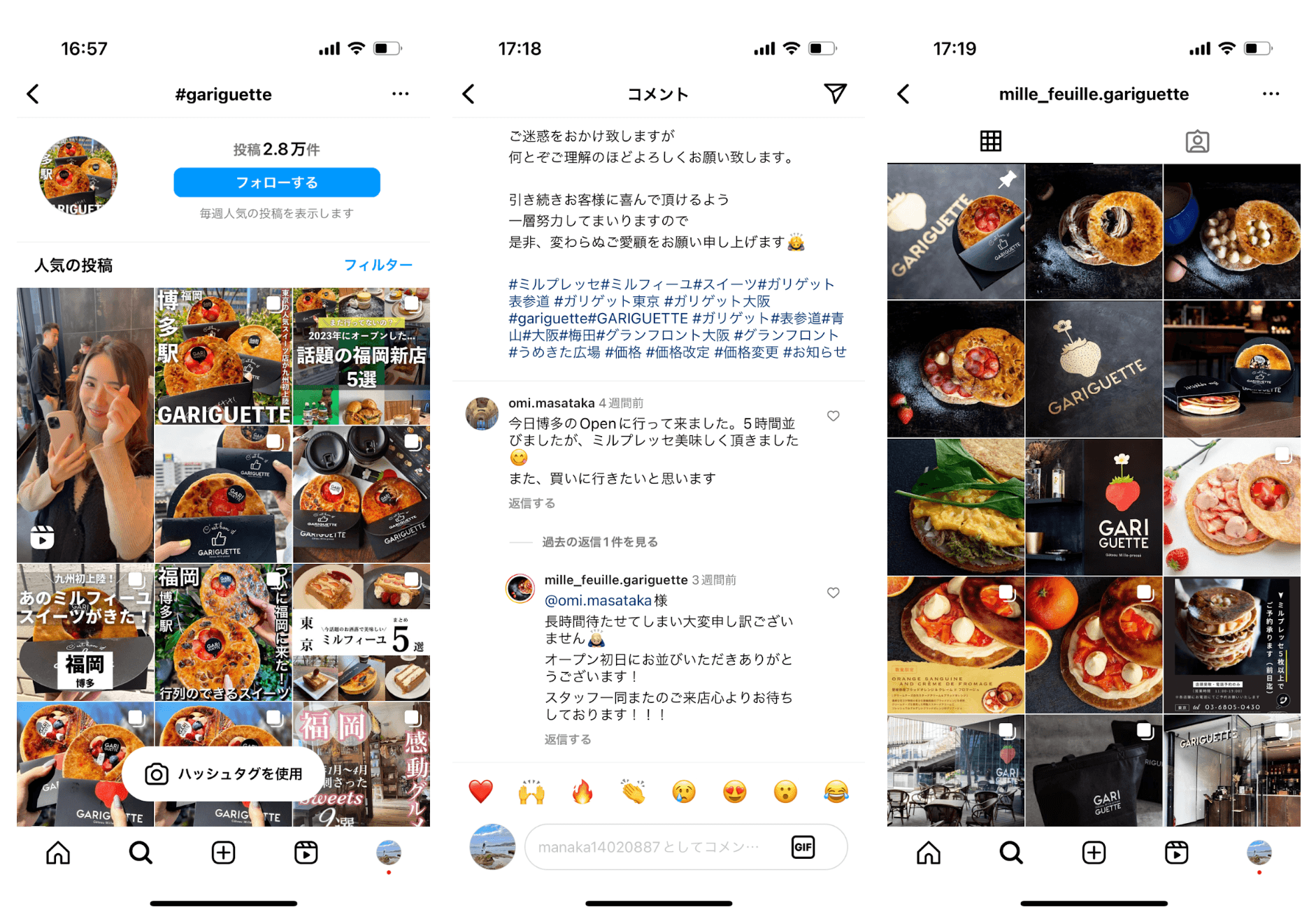 表参道から店舗営業を開始し、現在では大阪、福岡にも店舗を構えています。顧客からの投稿のみでも2.8万件あります。食べ物系インフルエンサーの方や、身近な友人も投稿を通じてコメントしていたことがきっかけで「食べたい」と興味を持つようになりました。企業公式内アカウントでもコメントに丁寧に対応されています。連日大行列ができています。