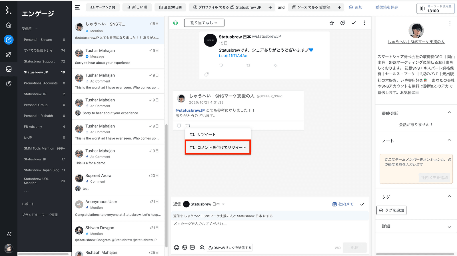 Statusbrewには、有料投稿への返信を集約する広告コメントマネジメント機能もあるため、より効率的に返信できます。