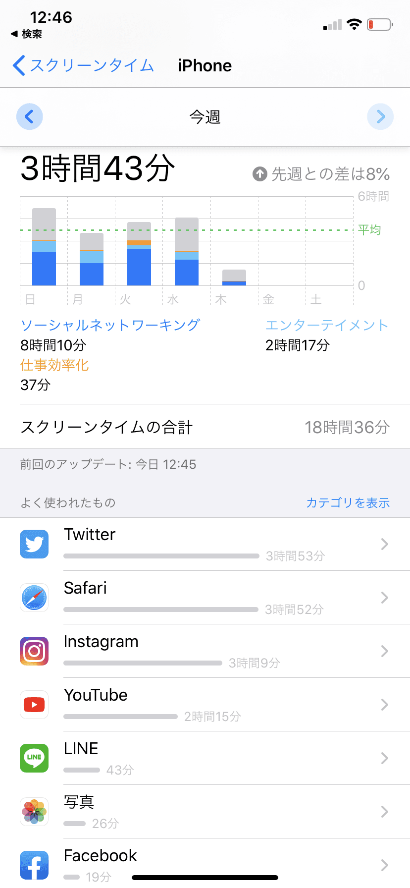 ちなみにこれ私の1週間のスクリーンタイムでモバイルの利用時間が出ています。1週間で3時間じゃなくて1日3時間の人ってすごい